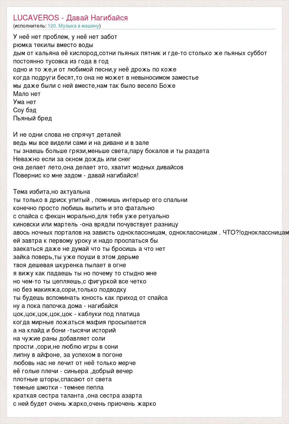 У неё нет проблем, у неё нет забот рюмка текилы вместо воды дым от кальяна её кислород,сотни пьяных пятник и где-то столько же пьяных суббот постоянно тусовка из года в год одно и то же,и от любимой песни,у неё дрожь по коже когда подруги бесят,то она не может в невыносимом заместье мы даже были с ней вместе,нам так было весело Боже Мало нет Ума нет Соу бэд Пьяный бред И не одни слова не спрячут деталей ведь мы все видели сами и на диване и в зале ты знаешь больше грязи,меньше света,пару бокалов и ты раздета Неважно если за окном дождь или снег она делает лето,она делает это, хватит модных дивайсов Повернис ко мне задом - давай нагибайся! Тема избита,но актуальна ты только в дриск упитый , помнишь интерьер его спальни конечно просто любишь выпить и это фатально с спайса с фекшн морально,для тебя уже ретуально киновски или мартель -она врядли почувствует разницу авось ночных порталов на зависть одноклассницам, одноклассницам . ЧТО?!одноклассницам ей завтра к первому уроку и надо проспаться бы заекаться даже не думай что ты бросишь а что нет зайка поверь,ты уже поуши в этом дерьме твоя дешевая шкуренка пылает в огне я вижу как падаешь ты но почему то стыдно мне но чем-то ты цепляешь,с фигуркой все четко но без макияжа,сори,только подводку ты будешь вспоминать юность как приход от спайса ну а пока папочка дома - нагибайся цок,цок,цок,цок,цок - каблуки под платица когда мирные ложаться мафия просыпается а на клайд и бони -тысячи историй на чужие раны добавляет соли прости ,сори,не люблю игры в сони липну в айфоне, за успехом в погоне любовь нас не лечит от неё только мерче её голые плечи - синьера ,добрый вечер плотные шторы,спасают от света темные шмотки - темнее пепла краткая сестра таланта ,она сестра азарта с ней будет очень жарко,очень приочень жарко