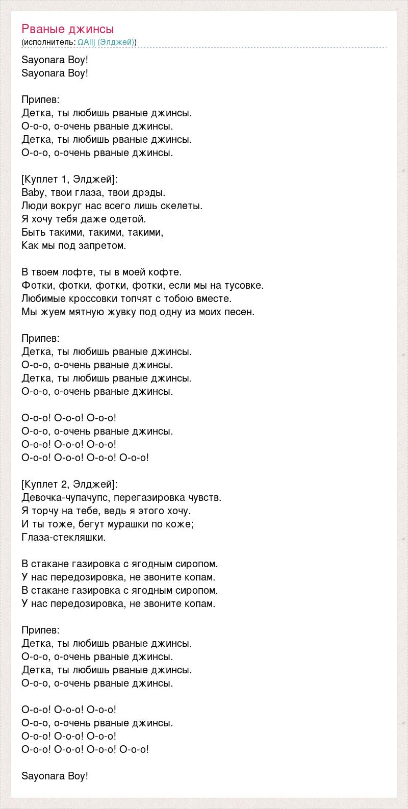 Sayonara Boy! Sayonara Boy! Припев: Детка, ты любишь рваные джинсы. О-о-о, о-очень рваные джинсы. Детка, ты любишь рваные джинсы. О-о-о, о-очень рваные джинсы. [Куплет 1, Элджей]: Baby, твои глаза, твои дрэды. Люди вокруг нас всего лишь скелеты. Я хочу тебя даже одетой. Быть такими, такими, такими, Как мы под запретом. В твоем лофте, ты в моей кофте. Фотки, фотки, фотки, фотки, если мы на тусовке. Любимые кроссовки топчят с тобою вместе. Мы жуем мятную жувку под одну из моих песен. Припев: Детка, ты любишь рваные джинсы. О-о-о, о-очень рваные джинсы. Детка, ты любишь рваные джинсы. О-о-о, о-очень рваные джинсы. О-о-о! О-о-о! О-о-о! О-о-о, о-очень рваные джинсы. О-о-о! О-о-о! О-о-о! О-о-о! О-о-о! О-о-о! О-о-о! [Куплет 2, Элджей]: Девочка-чупачупс, перегазировка чувств. Я торчу на тебе, ведь я этого хочу. И ты тоже, бегут мурашки по коже; Глаза-стекляшки. В стакане газировка с ягодным сиропом. У нас передозировка, не звоните копам. В стакане газировка с ягодным сиропом. У нас передозировка, не звоните копам. Припев: Детка, ты любишь рваные джинсы. О-о-о, о-очень рваные джинсы. Детка, ты любишь рваные джинсы. О-о-о, о-очень рваные джинсы. О-о-о! О-о-о! О-о-о! О-о-о, о-очень рваные джинсы. О-о-о! О-о-о! О-о-о! О-о-о! О-о-о! О-о-о! О-о-о! Sayonara Boy!