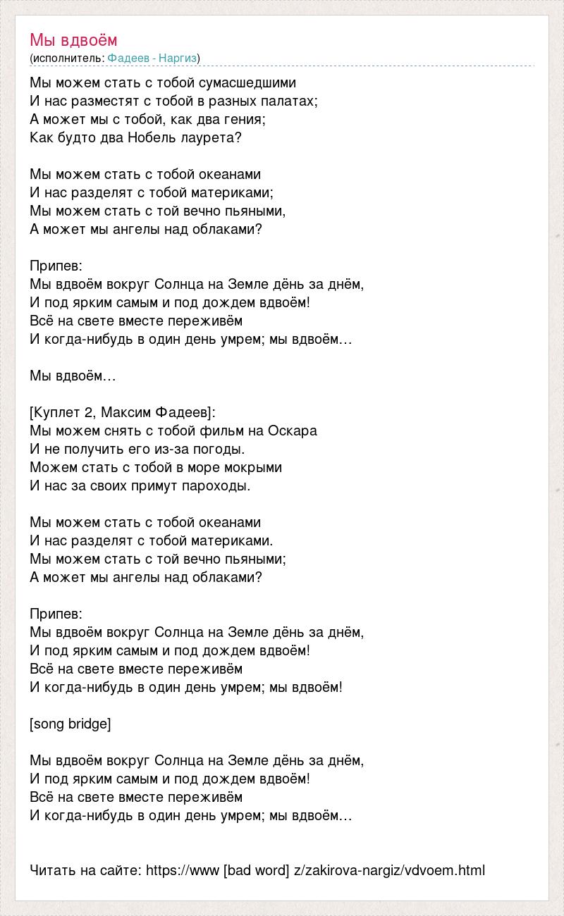 Мы можем стать с тобой сумасшедшими И нас разместят с тобой в разных палатах; А может мы с тобой, как два гения; Как будто два Нобель лаурета? Мы можем стать с тобой океанами И нас разделят с тобой материками; Мы можем стать с той вечно пьяными, А может мы ангелы над облаками? Припев: Мы вдвоём вокруг Солнца на Земле дёнь за днём, И под ярким самым и под дождем вдвоём! Всё на свете вместе переживём И когда-нибудь в один день умрем; мы вдвоём… Мы вдвоём… [Куплет 2, Максим Фадеев]: Мы можем снять с тобой фильм на Оскара И не получить его из-за погоды. Можем стать с тобой в море мокрыми И нас за своих примут пароходы. Мы можем стать с тобой океанами И нас разделят с тобой материками. Мы можем стать с той вечно пьяными; А может мы ангелы над облаками? Припев: Мы вдвоём вокруг Солнца на Земле дёнь за днём, И под ярким самым и под дождем вдвоём! Всё на свете вместе переживём И когда-нибудь в один день умрем; мы вдвоём! [song bridge] Мы вдвоём вокруг Солнца на Земле дёнь за днём, И под ярким самым и под дождем вдвоём! Всё на свете вместе переживём И когда-нибудь в один день умрем; мы вдвоём… Читать на сайте: https://www [bad word] z/zakirova-nargiz/vdvoem.html