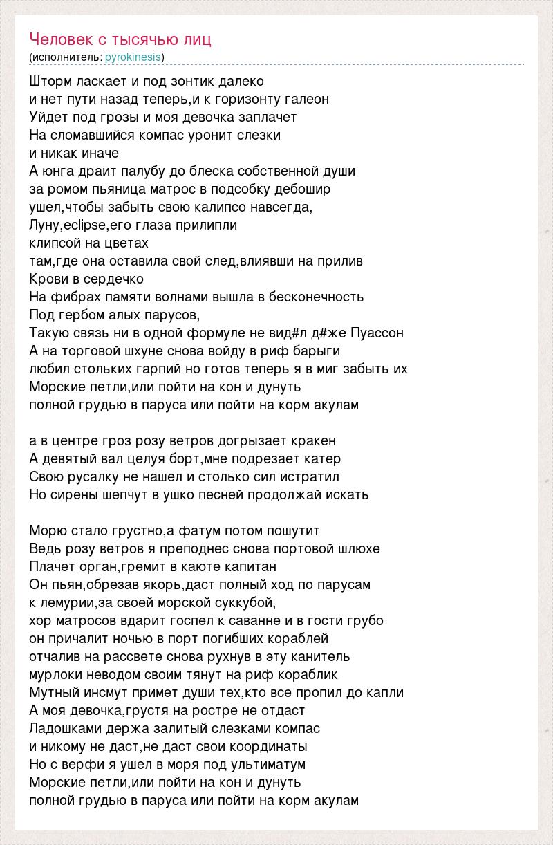 Шторм ласкает и под зонтик далеко и нет пути назад теперь,и к горизонту галеон Уйдет под грозы и моя девочка заплачет На сломавшийся компас уронит слезки и никак иначе А юнга драит палубу до блеска собственной души за ромом пьяница матрос в подсобку дебошир ушел,чтобы забыть свою калипсо навсегда, Луну,eclipse,его глаза прилипли клипсой на цветах там,где она оставила свой след,влиявши на прилив Крови в сердечко На фибрах памяти волнами вышла в бесконечность Под гербом алых парусов, Такую связь ни в одной формуле не вид#л д#же Пуассон А на торговой шхуне снова войду в риф барыги любил стольких гарпий но готов теперь я в миг забыть их Морские петли,или пойти на кон и дунуть полной грудью в паруса или пойти на корм акулам а в центре гроз розу ветров догрызает кракен А девятый вал целуя борт,мне подрезает катер Свою русалку не нашел и столько сил истратил Но сирены шепчут в ушко песней продолжай искать Морю стало грустно,а фатум потом пошутит Ведь розу ветров я преподнес снова портовой шлюхе Плачет орган,гремит в каюте капитан Он пьян,обрезав якорь,даст полный ход по парусам к лемурии,за своей морской суккубой, хор матросов вдарит госпел к саванне и в гости грубо он причалит ночью в порт погибших кораблей отчалив на рассвете снова рухнув в эту канитель мурлоки неводом своим тянут на риф кораблик Мутный инсмут примет души тех,кто все пропил до капли А моя девочка,грустя на ростре не отдаст Ладошками держа залитый слезками компас и никому не даст,не даст свои координаты Но с верфи я ушел в моря под ультиматум Морские петли,или пойти на кон и дунуть полной грудью в паруса или пойти на корм акулам