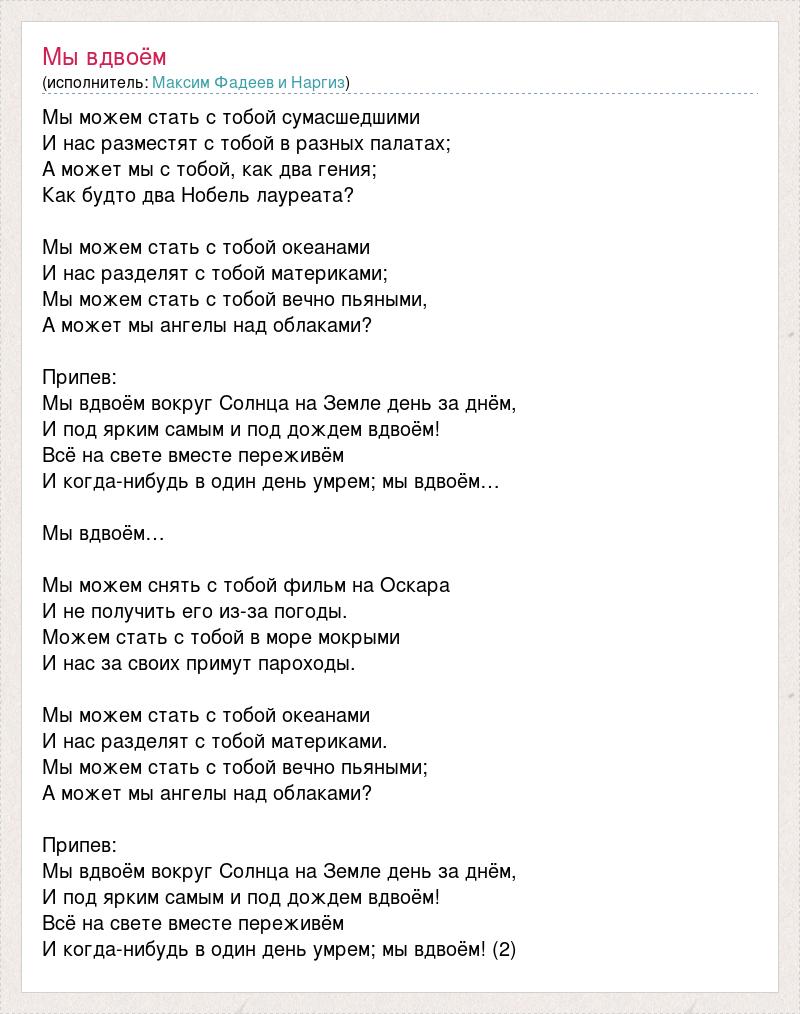 Мы можем стать с тобой сумасшедшими И нас разместят с тобой в разных палатах; А может мы с тобой, как два гения; Как будто два Нобель лауреата? Мы можем стать с тобой океанами И нас разделят с тобой материками; Мы можем стать с тобой вечно пьяными, А может мы ангелы над облаками? Припев: Мы вдвоём вокруг Солнца на Земле день за днём, И под ярким самым и под дождем вдвоём! Всё на свете вместе переживём И когда-нибудь в один день умрем; мы вдвоём… Мы вдвоём… Мы можем снять с тобой фильм на Оскара И не получить его из-за погоды. Можем стать с тобой в море мокрыми И нас за своих примут пароходы. Мы можем стать с тобой океанами И нас разделят с тобой материками. Мы можем стать с тобой вечно пьяными; А может мы ангелы над облаками? Припев: Мы вдвоём вокруг Солнца на Земле день за днём, И под ярким самым и под дождем вдвоём! Всё на свете вместе переживём И когда-нибудь в один день умрем; мы вдвоём! (2)