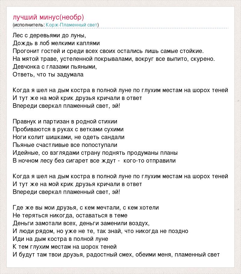 Лес с деревьями до луны, Дождь в лоб мелкими каплями Прогонит гостей и среди всех своих остались лишь самые стойкие. На мятой траве, устеленной покрывалами, вокруг все выпито, скурено. Девчонка с глазами пьяными, Ответь, что ты задумала Когда я шел на дым костра в полной луне по глухим местам на шорох теней И тут же на мой крик друзья кричали в ответ Впереди сверкал пламенный свет, эй! Правнук и партизан в родной стихии Пробиваются в руках с ветками сухими Ноги колит шишками, не одеть сандали Пьяные счастливые все попоступали Идейные, со взглядами страну поднять продуманы планы В ночном лесу без сигарет все ждут - кого-то отправили Когда я шел на дым костра в полной луне по глухим местам на шорох теней И тут же на мой крик друзья кричали в ответ Впереди сверкал пламенный свет, эй! Где же вы мои друзья, с кем мечтали, с кем хотели Не теряться никогда, оставаться в теме Деньги замотали всех, деньги заменили воздух, И люди рядом, но уже не те, так знай, что никогда не поздно Иди на дым костра в полной луне К тем глухим местам на шорох теней И будут там твои друзья, радостный смех, обеими меня, пламенный свет