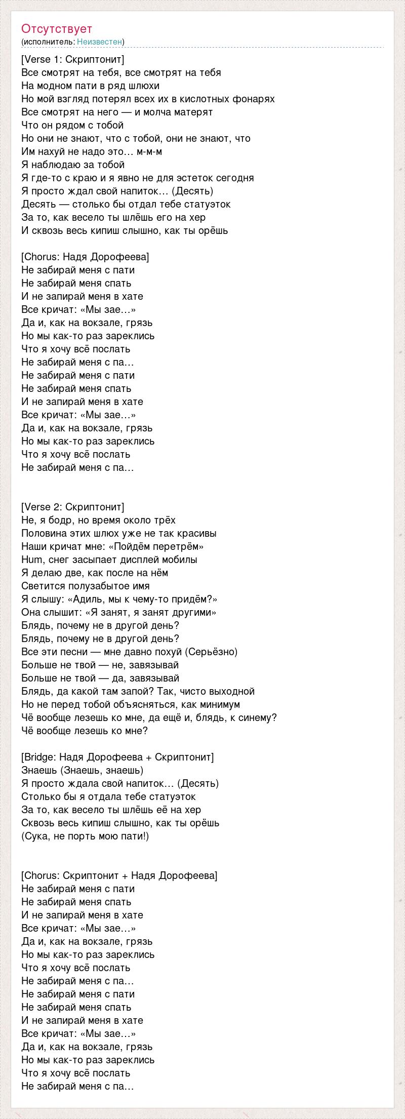 [Verse 1: Скриптонит] Все смотрят на тебя, все смотрят на тебя На модном пати в ряд шлюхи Но мой взгляд потерял всех их в кислотных фонарях Все смотрят на него — и молча матерят Что он рядом с тобой Но они не знают, что с тобой, они не знают, что Им нахуй не надо это… м-м-м Я наблюдаю за тобой Я где-то с краю и я явно не для эстеток сегодня Я просто ждал свой напиток… (Десять) Десять — столько бы отдал тебе статуэток За то, как весело ты шлёшь его на хер И сквозь весь кипиш слышно, как ты орёшь [Chorus: Надя Дорофеева] Не забирай меня с пати Не забирай меня спать И не запирай меня в хате Все кричат: «Мы зае…» Да и, как на вокзале, грязь Но мы как-то раз зареклись Что я хочу всё послать Не забирай меня с па… Не забирай меня с пати Не забирай меня спать И не запирай меня в хате Все кричат: «Мы зае…» Да и, как на вокзале, грязь Но мы как-то раз зареклись Что я хочу всё послать Не забирай меня с па… [Verse 2: Скриптонит] Не, я бодр, но время около трёх Половина этих шлюх уже не так красивы Наши кричат мне: «Пойдём перетрём» Hum, снег засыпает дисплей мобилы Я делаю две, как после на нём Светится полузабытое имя Я слышу: «Адиль, мы к чему-то придём?» Она слышит: «Я занят, я занят другими» Блядь, почему не в другой день? Блядь, почему не в другой день? Все эти песни — мне давно похуй (Серьёзно) Больше не твой — не, завязывай Больше не твой — да, завязывай Блядь, да какой там запой? Так, чисто выходной Но не перед тобой объясняться, как минимум Чё вообще лезешь ко мне, да ещё и, блядь, к синему? Чё вообще лезешь ко мне? [Bridge: Надя Дорофеева + Скриптонит] Знаешь (Знаешь, знаешь) Я просто ждала свой напиток… (Десять) Столько бы я отдала тебе статуэток За то, как весело ты шлёшь её на хер Сквозь весь кипиш слышно, как ты орёшь (Сука, не порть мою пати!) [Chorus: Скриптонит + Надя Дорофеева] Не забирай меня с пати Не забирай меня спать И не запирай меня в хате Все кричат: «Мы зае…» Да и, как на вокзале, грязь Но мы как-то раз зареклись Что я хочу всё послать Не забирай меня с па… Не забирай меня с пати Не забирай меня спать И не запирай меня в хате Все кричат: «Мы зае…» Да и, как на вокзале, грязь Но мы как-то раз зареклись Что я хочу всё послать Не забирай меня с па…