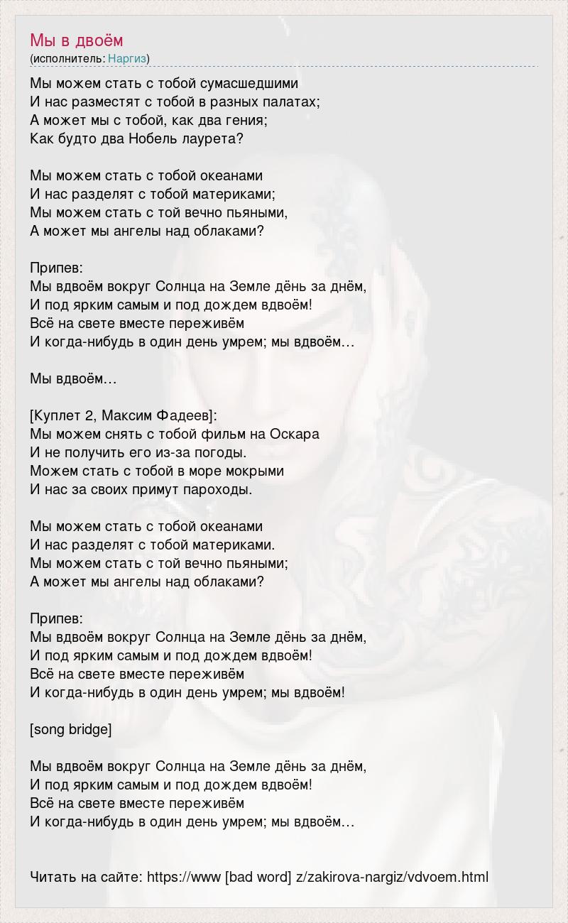 Мы можем стать с тобой сумасшедшими И нас разместят с тобой в разных палатах; А может мы с тобой, как два гения; Как будто два Нобель лаурета? Мы можем стать с тобой океанами И нас разделят с тобой материками; Мы можем стать с той вечно пьяными, А может мы ангелы над облаками? Припев: Мы вдвоём вокруг Солнца на Земле дёнь за днём, И под ярким самым и под дождем вдвоём! Всё на свете вместе переживём И когда-нибудь в один день умрем; мы вдвоём… Мы вдвоём… [Куплет 2, Максим Фадеев]: Мы можем снять с тобой фильм на Оскара И не получить его из-за погоды. Можем стать с тобой в море мокрыми И нас за своих примут пароходы. Мы можем стать с тобой океанами И нас разделят с тобой материками. Мы можем стать с той вечно пьяными; А может мы ангелы над облаками? Припев: Мы вдвоём вокруг Солнца на Земле дёнь за днём, И под ярким самым и под дождем вдвоём! Всё на свете вместе переживём И когда-нибудь в один день умрем; мы вдвоём! [song bridge] Мы вдвоём вокруг Солнца на Земле дёнь за днём, И под ярким самым и под дождем вдвоём! Всё на свете вместе переживём И когда-нибудь в один день умрем; мы вдвоём… Читать на сайте: https://www [bad word] z/zakirova-nargiz/vdvoem.html