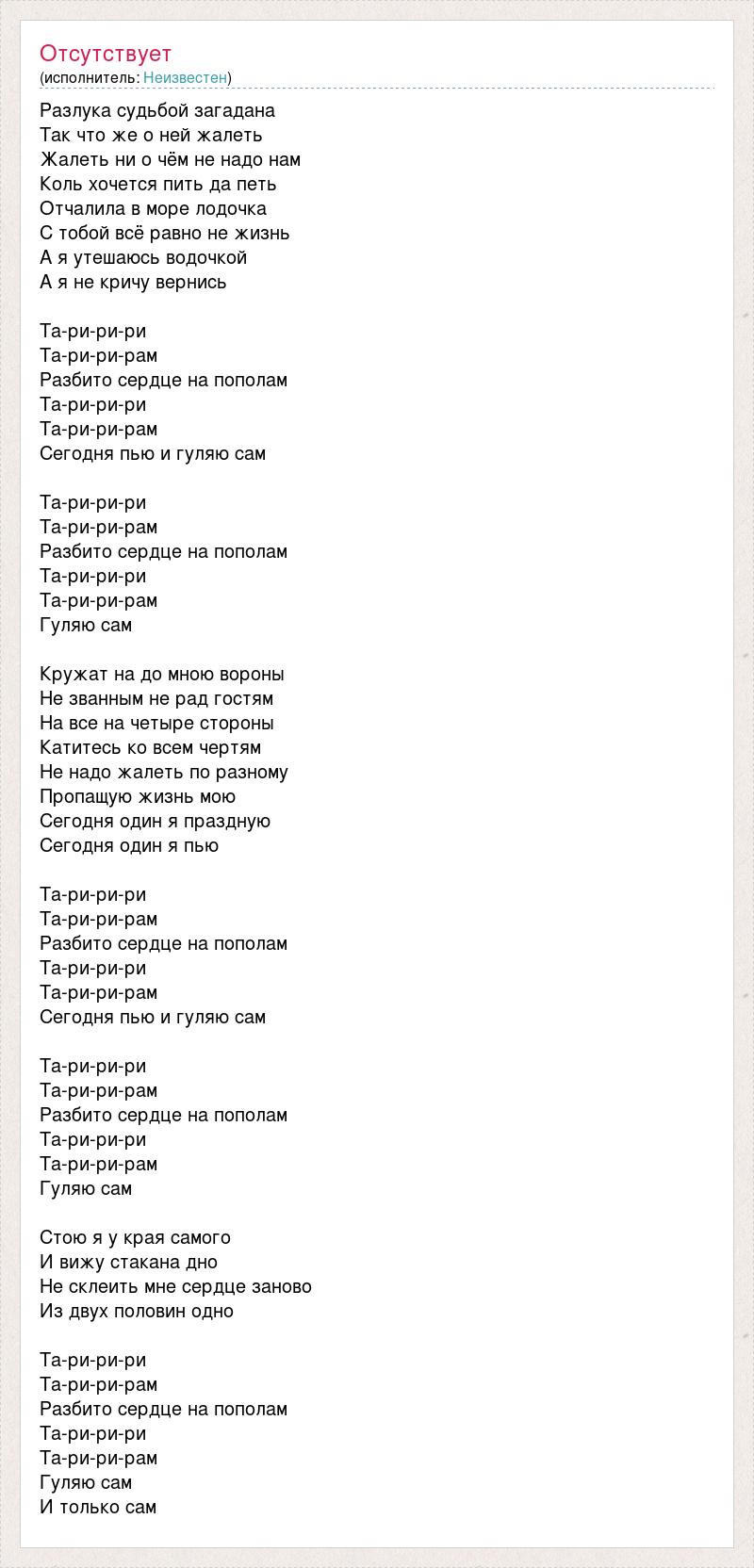 Разлука судьбой загадана Так что же о ней жалеть Жалеть ни о чём не надо нам Коль хочется пить да петь Отчалила в море лодочка С тобой всё равно не жизнь А я утешаюсь водочкой А я не кричу вернись Та-ри-ри-ри Та-ри-ри-рам Разбито сердце на пополам Та-ри-ри-ри Та-ри-ри-рам Сегодня пью и гуляю сам Та-ри-ри-ри Та-ри-ри-рам Разбито сердце на пополам Та-ри-ри-ри Та-ри-ри-рам Гуляю сам Кружат на до мною вороны Не званным не рад гостям На все на четыре стороны Катитесь ко всем чертям Не надо жалеть по разному Пропащую жизнь мою Сегодня один я праздную Сегодня один я пью Та-ри-ри-ри Та-ри-ри-рам Разбито сердце на пополам Та-ри-ри-ри Та-ри-ри-рам Сегодня пью и гуляю сам Та-ри-ри-ри Та-ри-ри-рам Разбито сердце на пополам Та-ри-ри-ри Та-ри-ри-рам Гуляю сам Стою я у края самого И вижу стакана дно Не склеить мне сердце заново Из двух половин одно Та-ри-ри-ри Та-ри-ри-рам Разбито сердце на пополам Та-ри-ри-ри Та-ри-ри-рам Гуляю сам И только сам