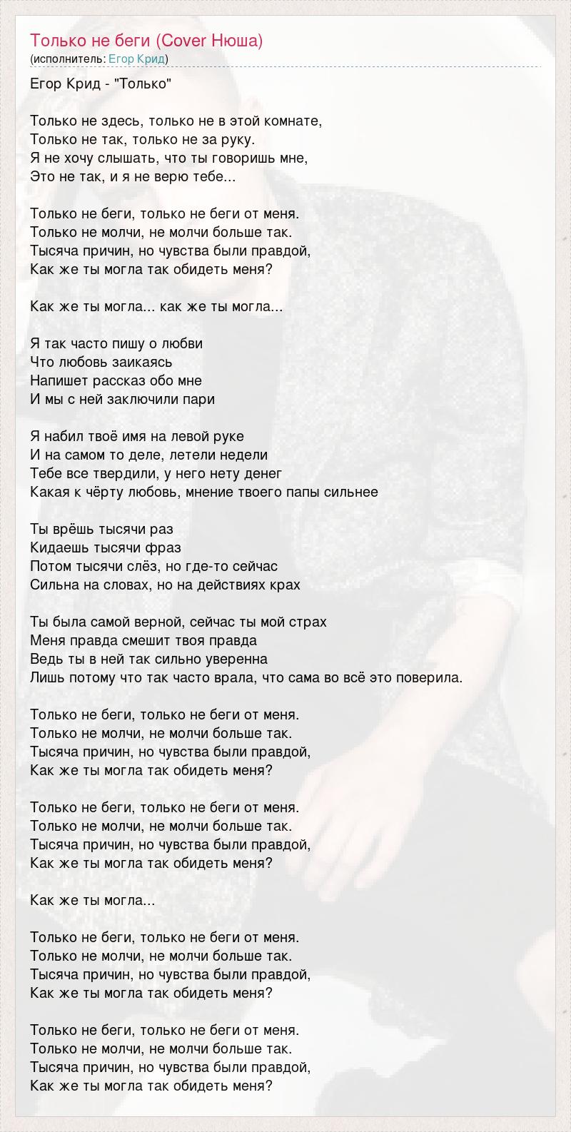 Егор Крид - "Только" Только не здесь, только не в этой комнате, Только не так, только не за руку. Я не хочу слышать, что ты говоришь мне, Это не так, и я не верю тебе... Только не беги, только не беги от меня. Только не молчи, не молчи больше так. Тысяча причин, но чувства были правдой, Как же ты могла так обидеть меня? Как же ты могла... как же ты могла... Я так часто пишу о любви Что любовь заикаясь Напишет рассказ обо мне И мы с ней заключили пари Я набил твоё имя на левой руке И на самом то деле, летели недели Тебе все твердили, у него нету денег Какая к чёрту любовь, мнение твоего папы сильнее Ты врёшь тысячи раз Кидаешь тысячи фраз Потом тысячи слёз, но где-то сейчас Сильна на словах, но на действиях крах Ты была самой верной, сейчас ты мой страх Меня правда смешит твоя правда Ведь ты в ней так сильно уверенна Лишь потому что так часто врала, что сама во всё это поверила. Только не беги, только не беги от меня. Только не молчи, не молчи больше так. Тысяча причин, но чувства были правдой, Как же ты могла так обидеть меня? Только не беги, только не беги от меня. Только не молчи, не молчи больше так. Тысяча причин, но чувства были правдой, Как же ты могла так обидеть меня? Как же ты могла... Только не беги, только не беги от меня. Только не молчи, не молчи больше так. Тысяча причин, но чувства были правдой, Как же ты могла так обидеть меня? Только не беги, только не беги от меня. Только не молчи, не молчи больше так. Тысяча причин, но чувства были правдой, Как же ты могла так обидеть меня?