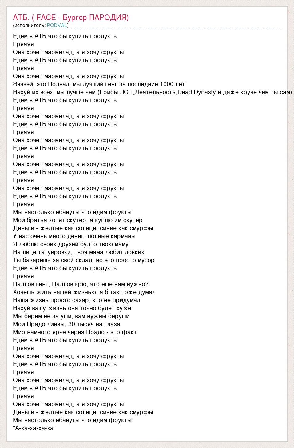 Едем в АТБ что бы купить продукты Гряяяя Она хочет мармелад, а я хочу фрукты Едем в АТБ что бы купить продукты Гряяяя Она хочет мармелад, а я хочу фрукты Эээээй, это Подвал, мы лучший генг за последние 1000 лет Нахуй их всех, мы лучше чем (Грибы,ЛСП,Деятельность,Dead Dynasty и даже круче чем ты сам) Едем в АТБ что бы купить продукты Гряяяя Она хочет мармелад, а я хочу фрукты Едем в АТБ что бы купить продукты Гряяяя Она хочет мармелад, а я хочу фрукты Едем в АТБ что бы купить продукты Гряяяя Она хочет мармелад, а я хочу фрукты Едем в АТБ что бы купить продукты Гряяяя Она хочет мармелад, а я хочу фрукты Едем в АТБ что бы купить продукты Гряяяя Мы настолько ебануты что едим фрукты Мои братья хотят скутер, я куплю им скутер Деньги - желтые как солнце, синие как смурфы У нас очень много денег, полные карманы Я люблю своих друзей будто твою маму На лице татуировки, твоя мама любит ловких Ты базаришь за свой склад, но это просто мусор Едем в АТБ что бы купить продукты Гряяяя Падлов генг, Падлов крю, что ещё нам нужно? Хочешь жить нашей жизнью, я б так тоже думал Наша жизнь просто сахар, кто её придумал Нахуй вашу жизнь она точно будет хуже Мы берём её за уши, вам нужны беруши Мои Прадо линзы, 30 тысяч на глаза Мир намного ярче через Прадо - это факт Едем в АТБ что бы купить продукты Гряяяя Она хочет мармелад, а я хочу фрукты Едем в АТБ что бы купить продукты Гряяяя Она хочет мармелад, а я хочу фрукты Едем в АТБ что бы купить продукты Гряяяя Она хочет мармелад, а я хочу фрукты Деньги - желтые как солнце, синие как смурфы Мы настолько ебануты что едим фрукты "А-ха-ха-ха-ха"