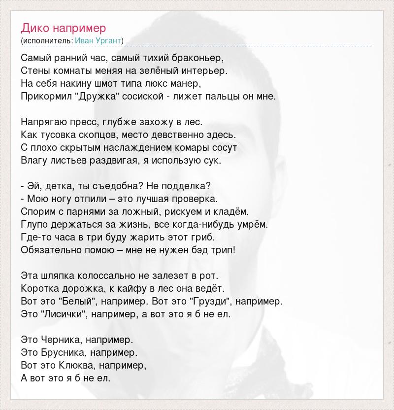 Самый ранний час, самый тихий браконьер, Стены комнаты меняя на зелёный интерьер. На себя накину шмот типа люкс манер, Прикормил "Дружка" сосиской - лижет пальцы он мне. Напрягаю пресс, глубже захожу в лес. Как тусовка скопцов, место девственно здесь. С плохо скрытым наслаждением комары сосут Влагу листьев раздвигая, я использую сук. - Эй, детка, ты съедобна? Не подделка? - Мою ногу отпили – это лучшая проверка. Спорим с парнями за ложный, рискуем и кладём. Глупо держаться за жизнь, все когда-нибудь умрём. Где-то часа в три буду жарить этот гриб. Обязательно помою – мне не нужен бэд трип! Эта шляпка колоссально не залезет в рот. Коротка дорожка, к кайфу в лес она ведёт. Вот это "Белый", например. Вот это "Грузди", например. Это "Лисички", например, а вот это я б не ел. Это Черника, например. Это Брусника, например. Вот это Клюква, например, А вот это я б не ел.