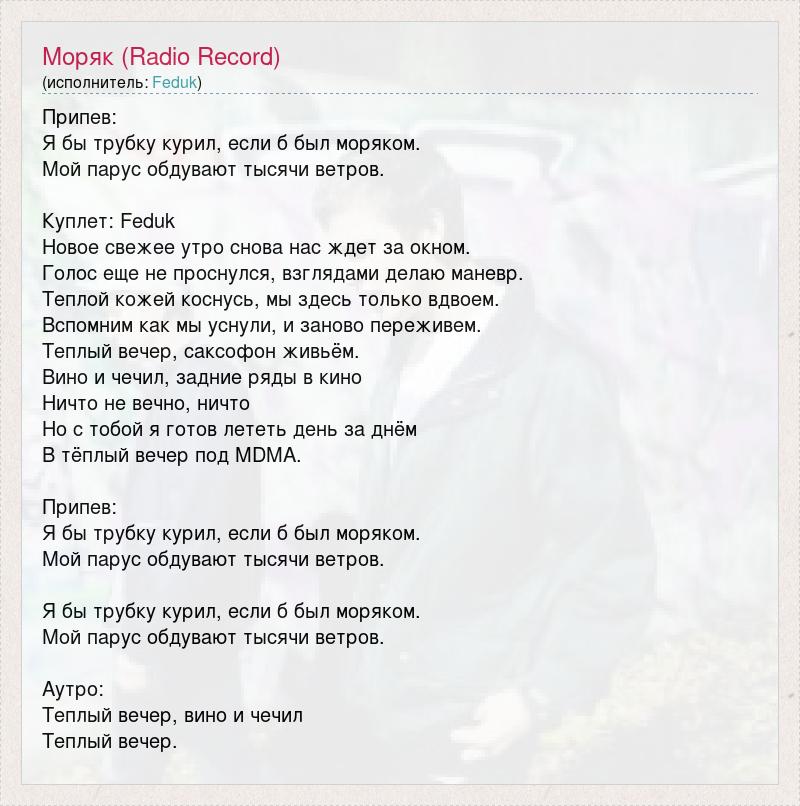 Припев: Я бы трубку курил, если б был моряком. Мой парус обдувают тысячи ветров. Куплет: Feduk Новое свежее утро снова нас ждет за окном. Голос еще не проснулся, взглядами делаю маневр. Теплой кожей коснусь, мы здесь только вдвоем. Вспомним как мы уснули, и заново переживем. Теплый вечер, саксофон живьём. Вино и чечил, задние ряды в кино Ничто не вечно, ничто Но с тобой я готов лететь день за днём В тёплый вечер под MDMA. Припев: Я бы трубку курил, если б был моряком. Мой парус обдувают тысячи ветров. Я бы трубку курил, если б был моряком. Мой парус обдувают тысячи ветров. Аутро: Теплый вечер, вино и чечил Теплый вечер.