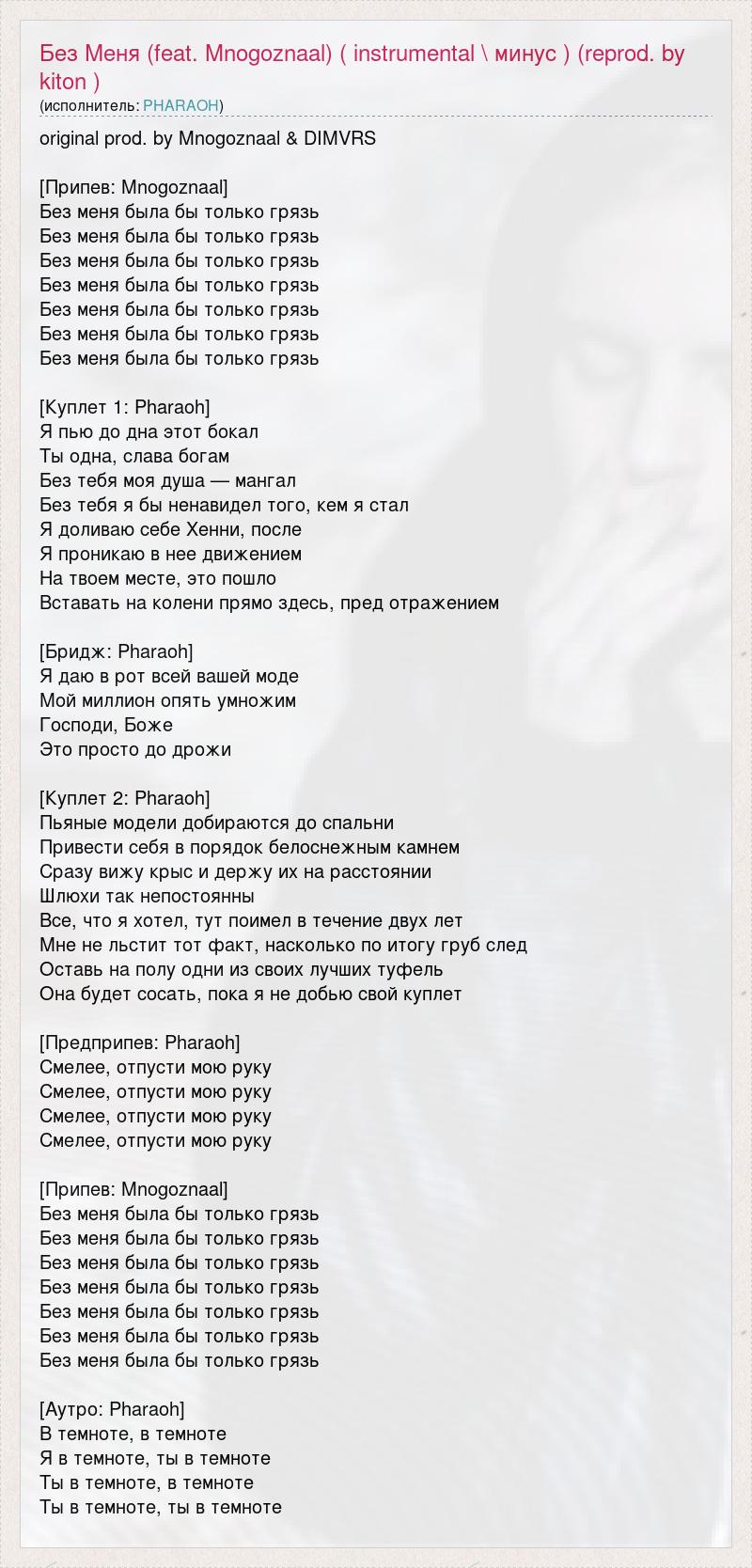 original prod. by Mnogoznaal & DIMVRS [Припев: Mnogoznaal] Без меня была бы только грязь Без меня была бы только грязь Без меня была бы только грязь Без меня была бы только грязь Без меня была бы только грязь Без меня была бы только грязь Без меня была бы только грязь [Куплет 1: Pharaoh] Я пью до дна этот бокал Ты одна, слава богам Без тебя моя душа — мангал Без тебя я бы ненавидел того, кем я стал Я доливаю себе Хенни, после Я проникаю в нее движением На твоем месте, это пошло Вставать на колени прямо здесь, пред отражением [Бридж: Pharaoh] Я даю в рот всей вашей моде Мой миллион опять умножим Господи, Боже Это просто до дрожи [Куплет 2: Pharaoh] Пьяные модели добираются до спальни Привести себя в порядок белоснежным камнем Сразу вижу крыс и держу их на расстоянии Шлюхи так непостоянны Все, что я хотел, тут поимел в течение двух лет Мне не льстит тот факт, насколько по итогу груб след Оставь на полу одни из своих лучших туфель Она будет сосать, пока я не добью свой куплет [Предприпев: Pharaoh] Смелее, отпусти мою руку Смелее, отпусти мою руку Смелее, отпусти мою руку Смелее, отпусти мою руку [Припев: Mnogoznaal] Без меня была бы только грязь Без меня была бы только грязь Без меня была бы только грязь Без меня была бы только грязь Без меня была бы только грязь Без меня была бы только грязь Без меня была бы только грязь [Аутро: Pharaoh] В темноте, в темноте Я в темноте, ты в темноте Ты в темноте, в темноте Ты в темноте, ты в темноте