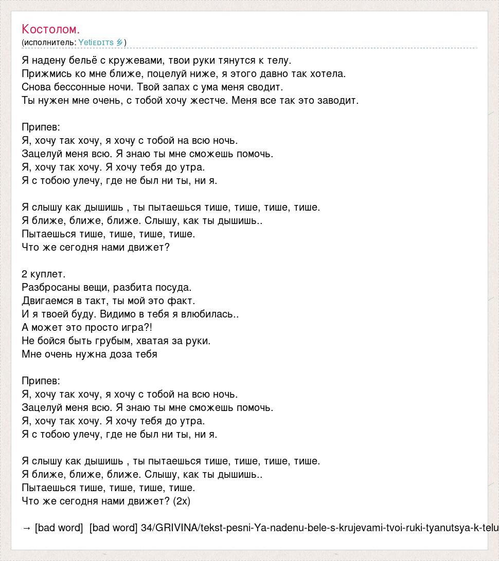 Я надену бельё с кружевами, твои руки тянутся к телу. Прижмись ко мне ближе, поцелуй ниже, я этого давно так хотела. Снова бессонные ночи. Твой запах с ума меня сводит. Ты нужен мне очень, с тобой хочу жестче. Меня все так это заводит. Припев: Я, хочу так хочу, я хочу с тобой на всю ночь. Зацелуй меня всю. Я знаю ты мне сможешь помочь. Я, хочу так хочу. Я хочу тебя до утра. Я с тобою улечу, где не был ни ты, ни я. Я слышу как дышишь , ты пытаешься тише, тише, тише, тише. Я ближе, ближе, ближе. Слышу, как ты дышишь.. Пытаешься тише, тише, тише, тише. Что же сегодня нами движет? 2 куплет. Разбросаны вещи, разбита посуда. Двигаемся в такт, ты мой это факт. И я твоей буду. Видимо в тебя я влюбилась.. А может это просто игра?! Не бойся быть грубым, хватая за руки. Мне очень нужна доза тебя Припев: Я, хочу так хочу, я хочу с тобой на всю ночь. Зацелуй меня всю. Я знаю ты мне сможешь помочь. Я, хочу так хочу. Я хочу тебя до утра. Я с тобою улечу, где не был ни ты, ни я. Я слышу как дышишь , ты пытаешься тише, тише, тише, тише. Я ближе, ближе, ближе. Слышу, как ты дышишь.. Пытаешься тише, тише, тише, тише. Что же сегодня нами движет? (2х) → [bad word] [bad word] 34/GRIVINA/tekst-pesni-Ya-nadenu-bele-s-krujevami-tvoi-ruki-tyanutsya-k-telu
