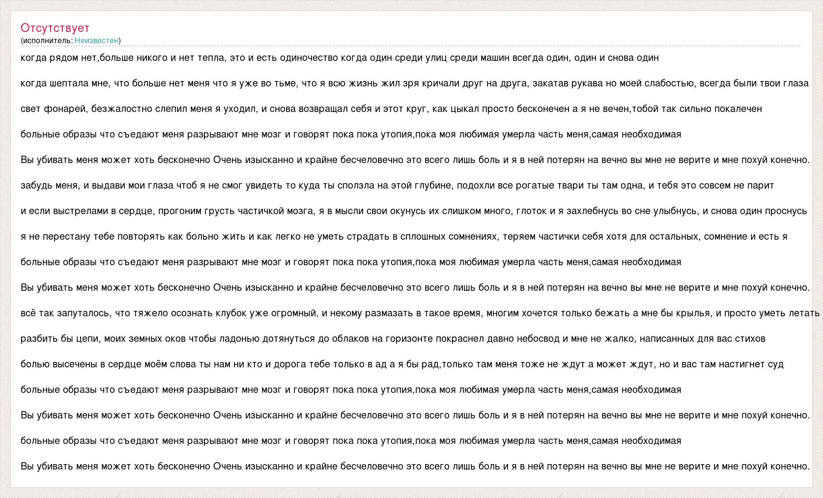 когда рядом нет,больше никого и нет тепла, это и есть одиночество когда один среди улиц среди машин всегда один, один и снова один когда шептала мне, что больше нет меня что я уже во тьме, что я всю жизнь жил зря кричали друг на друга, закатав рукава но моей слабостью, всегда были твои глаза свет фонарей, безжалостно слепил меня я уходил, и снова возвращал себя и этот круг, как цыкал просто бесконечен а я не вечен,тобой так сильно покалечен больные образы что съедают меня разрывают мне мозг и говорят пока пока утопия,пока моя любимая умерла часть меня,самая необходимая Вы убивать меня может хоть бесконечно Очень изысканно и крайне бесчеловечно это всего лишь боль и я в ней потерян на вечно вы мне не верите и мне похуй конечно. забудь меня, и выдави мои глаза чтоб я не смог увидеть то куда ты сползла на этой глубине, подохли все рогатые твари ты там одна, и тебя это совсем не парит и если выстрелами в сердце, прогоним грусть частичкой мозга, я в мысли свои окунусь их слишком много, глоток и я захлебнусь во сне улыбнусь, и снова один проснусь я не перестану тебе повторять как больно жить и как легко не уметь страдать в сплошных сомнениях, теряем частички себя хотя для остальных, сомнение и есть я больные образы что съедают меня разрывают мне мозг и говорят пока пока утопия,пока моя любимая умерла часть меня,самая необходимая Вы убивать меня может хоть бесконечно Очень изысканно и крайне бесчеловечно это всего лишь боль и я в ней потерян на вечно вы мне не верите и мне похуй конечно. всё так запуталось, что тяжело осознать клубок уже огромный, и некому размазать в такое время, многим хочется только бежать а мне бы крылья, и просто уметь летать разбить бы цепи, моих земных оков чтобы ладонью дотянуться до облаков на горизонте покраснел давно небосвод и мне не жалко, написанных для вас стихов болью высечены в сердце моём слова ты нам ни кто и дорога тебе только в ад а я бы рад,только там меня тоже не ждут а может ждут, но и вас там настигнет суд больные образы что съедают меня разрывают мне мозг и говорят пока пока утопия,пока моя любимая умерла часть меня,самая необходимая Вы убивать меня может хоть бесконечно Очень изысканно и крайне бесчеловечно это всего лишь боль и я в ней потерян на вечно вы мне не верите и мне похуй конечно. больные образы что съедают меня разрывают мне мозг и говорят пока пока утопия,пока моя любимая умерла часть меня,самая необходимая Вы убивать меня может хоть бесконечно Очень изысканно и крайне бесчеловечно это всего лишь боль и я в ней потерян на вечно вы мне не верите и мне похуй конечно.