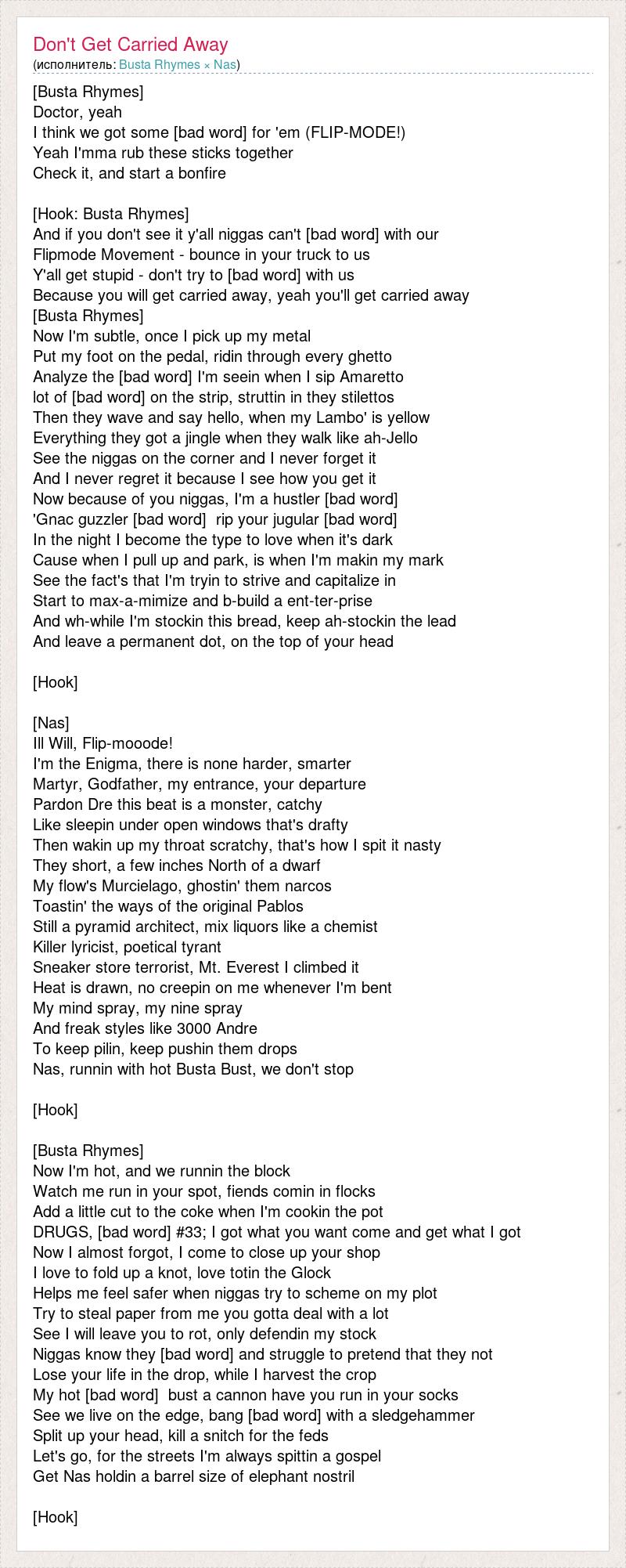 [Busta Rhymes] Doctor, yeah I think we got some [bad word] for 'em (FLIP-MODE!) Yeah I'mma rub these sticks together Check it, and start a bonfire [Hook: Busta Rhymes] And if you don't see it y'all niggas can't [bad word] with our Flipmode Movement - bounce in your truck to us Y'all get stupid - don't try to [bad word] with us Because you will get carried away, yeah you'll get carried away [Busta Rhymes] Now I'm subtle, once I pick up my metal Put my foot on the pedal, ridin through every ghetto Analyze the [bad word] I'm seein when I sip Amaretto lot of [bad word] on the strip, struttin in they stilettos Then they wave and say hello, when my Lambo' is yellow Everything they got a jingle when they walk like ah-Jello See the niggas on the corner and I never forget it And I never regret it because I see how you get it Now because of you niggas, I'm a hustler [bad word] 'Gnac guzzler [bad word] rip your jugular [bad word] In the night I become the type to love when it's dark Cause when I pull up and park, is when I'm makin my mark See the fact's that I'm tryin to strive and capitalize in Start to max-a-mimize and b-build a ent-ter-prise And wh-while I'm stockin this bread, keep ah-stockin the lead And leave a permanent dot, on the top of your head [Hook] [Nas] Ill Will, Flip-mooode! I'm the Enigma, there is none harder, smarter Martyr, Godfather, my entrance, your departure Pardon Dre this beat is a monster, catchy Like sleepin under open windows that's drafty Then wakin up my throat scratchy, that's how I spit it nasty They short, a few inches North of a dwarf My flow's Murcielago, ghostin' them narcos Toastin' the ways of the original Pablos Still a pyramid architect, mix liquors like a chemist Killer lyricist, poetical tyrant Sneaker store terrorist, Mt. Everest I climbed it Heat is drawn, no creepin on me whenever I'm bent My mind spray, my nine spray And freak styles like 3000 Andre To keep pilin, keep pushin them drops Nas, runnin with hot Busta Bust, we don't stop [Hook] [Busta Rhymes] Now I'm hot, and we runnin the block Watch me run in your spot, fiends comin in flocks Add a little cut to the coke when I'm cookin the pot DRUGS, [bad word] #33; I got what you want come and get what I got Now I almost forgot, I come to close up your shop I love to fold up a knot, love totin the Glock Helps me feel safer when niggas try to scheme on my plot Try to steal paper from me you gotta deal with a lot See I will leave you to rot, only defendin my stock Niggas know they [bad word] and struggle to pretend that they not Lose your life in the drop, while I harvest the crop My hot [bad word] bust a cannon have you run in your socks See we live on the edge, bang [bad word] with a sledgehammer Split up your head, kill a snitch for the feds Let's go, for the streets I'm always spittin a gospel Get Nas holdin a barrel size of elephant nostril [Hook]