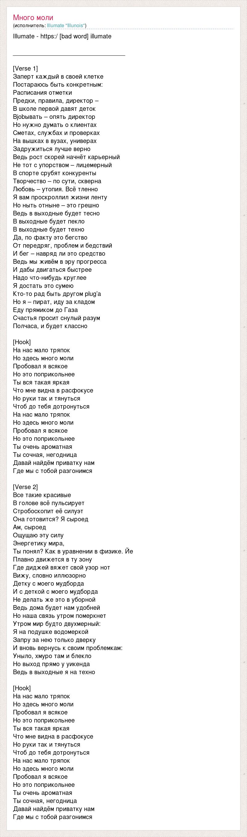 Illumate - https:/ [bad word] illumate _________________________________ [Verse 1] Заперт каждый в своей клетке Постараюсь быть конкретным: Расписания отметки Предки, правила, директор – В школе первой давят деток Вjobывать – опять директор Но нужно думать о клиентах Сметах, службах и проверках На вышках в вузах, универах Задружиться лучше верно Ведь рост скорей начнёт карьерный Не тот с упорством – лицемерный В спорте срубят конкуренты Творчество – по сути, скверна Любовь – утопия. Всё тленно Я вам проскроллил жизни ленту Но ныть отныне – это грешно Ведь в выходные будет тесно В выходные будет пекло В выходные будет техно Да, по факту это бегство От передряг, проблем и бедствий И бег – навряд ли это средство Ведь мы живём в эру прогресса И дабы двигаться быстрее Надо что-нибудь круглее Я достать это сумею Кто-то рад быть другом plug’а Но я – пират, иду за кладом Еду прямиком до Газа Счастья просит снулый разум Полчаса, и будет классно [Hook] На нас мало тряпок Но здесь много моли Пробовал я всякое Но это поприкольнее Ты вся такая яркая Что мне видна в расфокусе Но руки так и тянуться Чтоб до тебя дотронуться На нас мало тряпок Но здесь много моли Пробовал я всякое Но это поприкольнее Ты очень ароматная Ты сочная, негодница Давай найдём приватку нам Где мы с тобой разгонимся [Verse 2] Все такие красивые В голове всё пульсирует Стробоскопит её силуэт Она готовится? Я сыроед Ам, сыроед Ощущаю эту силу Энергетику мира, Ты понял? Как в уравнении в физике. Йе Плавно движется в ту зону Где диджей вяжет свой узор нот Вижу, словно иллюзорно Детку с моего мудборда И с деткой с моего мудборда Не делать же это в уборной Ведь дома будет нам удобней Но наша связь утром померкнет Утром мир будто двухмерный: Я на подушке водомеркой Запру за нею только дверку И вновь вернусь к своим проблемкам: Уныло, хмуро там и блекло Но выход прямо у уикенда Ведь в выходные я на техно [Hook] На нас мало тряпок Но здесь много моли Пробовал я всякое Но это поприкольнее Ты вся такая яркая Что мне видна в расфокусе Но руки так и тянуться Чтоб до тебя дотронуться На нас мало тряпок Но здесь много моли Пробовал я всякое Но это поприкольнее Ты очень ароматная Ты сочная, негодница Давай найдём приватку нам Где мы с тобой разгонимся