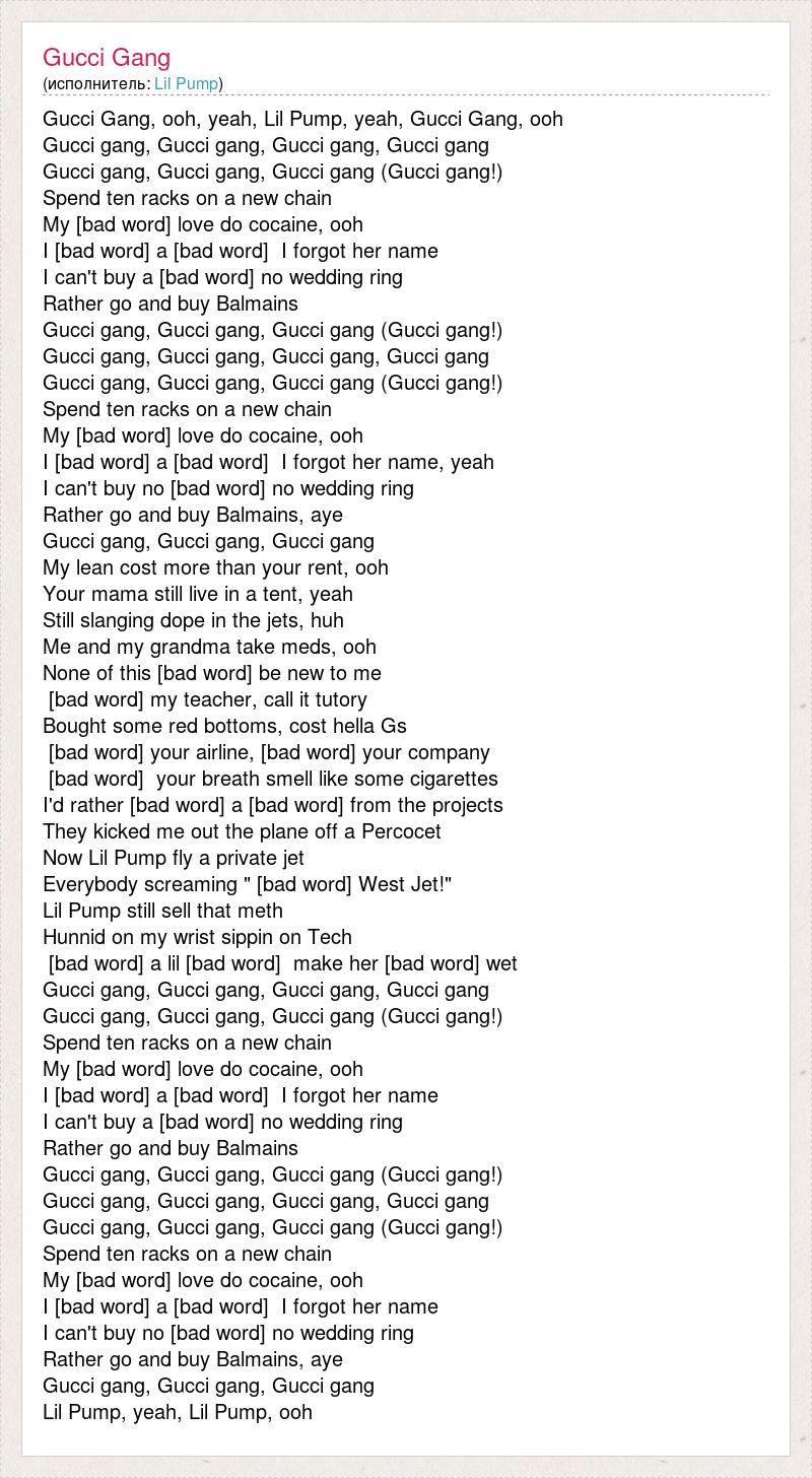 Gucci Gang, ooh, yeah, Lil Pump, yeah, Gucci Gang, ooh Gucci gang, Gucci gang, Gucci gang, Gucci gang Gucci gang, Gucci gang, Gucci gang (Gucci gang!) Spend ten racks on a new chain My [bad word] love do cocaine, ooh I [bad word] a [bad word] I forgot her name I can't buy a [bad word] no wedding ring Rather go and buy Balmains Gucci gang, Gucci gang, Gucci gang (Gucci gang!) Gucci gang, Gucci gang, Gucci gang, Gucci gang Gucci gang, Gucci gang, Gucci gang (Gucci gang!) Spend ten racks on a new chain My [bad word] love do cocaine, ooh I [bad word] a [bad word] I forgot her name, yeah I can't buy no [bad word] no wedding ring Rather go and buy Balmains, aye Gucci gang, Gucci gang, Gucci gang My lean cost more than your rent, ooh Your mama still live in a tent, yeah Still slanging dope in the jets, huh Me and my grandma take meds, ooh None of this [bad word] be new to me [bad word] my teacher, call it tutory Bought some red bottoms, cost hella Gs [bad word] your airline, [bad word] your company [bad word] your breath smell like some cigarettes I'd rather [bad word] a [bad word] from the projects They kicked me out the plane off a Percocet Now Lil Pump fly a private jet Everybody screaming " [bad word] West Jet!" Lil Pump still sell that meth Hunnid on my wrist sippin on Tech [bad word] a lil [bad word] make her [bad word] wet Gucci gang, Gucci gang, Gucci gang, Gucci gang Gucci gang, Gucci gang, Gucci gang (Gucci gang!) Spend ten racks on a new chain My [bad word] love do cocaine, ooh I [bad word] a [bad word] I forgot her name I can't buy a [bad word] no wedding ring Rather go and buy Balmains Gucci gang, Gucci gang, Gucci gang (Gucci gang!) Gucci gang, Gucci gang, Gucci gang, Gucci gang Gucci gang, Gucci gang, Gucci gang (Gucci gang!) Spend ten racks on a new chain My [bad word] love do cocaine, ooh I [bad word] a [bad word] I forgot her name I can't buy no [bad word] no wedding ring Rather go and buy Balmains, aye Gucci gang, Gucci gang, Gucci gang Lil Pump, yeah, Lil Pump, ooh
