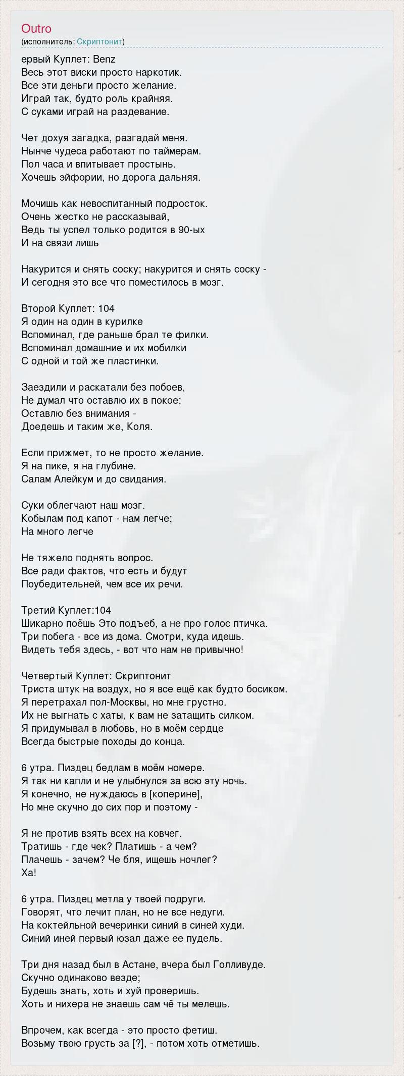 ервый Куплет: Benz Весь этот виски просто наркотик. Все эти деньги просто желание. Играй так, будто роль крайняя. С суками играй на раздевание. Чет дохуя загадка, разгадай меня. Нынче чудеса работают по таймерам. Пол часа и впитывает простынь. Хочешь эйфории, но дорога дальняя. Мочишь как невоспитанный подросток. Очень жестко не рассказывай, Ведь ты успел только родится в 90-ых И на связи лишь Накурится и снять соску; накурится и снять соску - И сегодня это все что поместилось в мозг. Второй Куплет: 104 Я один на один в курилке Вспоминал, где раньше брал те филки. Вспоминал домашние и их мобилки С одной и той же пластинки. Заездили и раскатали без побоев, Не думал что оставлю их в покое; Оставлю без внимания - Доедешь и таким же, Коля. Если прижмет, то не просто желание. Я на пике, я на глубине. Салам Алейкум и до свидания. Суки облегчают наш мозг. Кобылам под капот - нам легче; На много легче Не тяжело поднять вопрос. Все ради фактов, что есть и будут Поубедительней, чем все их речи. Третий Куплет:104 Шикарно поёшь Это подъеб, а не про голос птичка. Три побега - все из дома. Смотри, куда идешь. Видеть тебя здесь, - вот что нам не привычно! Четвертый Куплет: Скриптонит Триста штук на воздух, но я все ещё как будто босиком. Я перетрахал пол-Москвы, но мне грустно. Их не выгнать с хаты, к вам не затащить силком. Я придумывал в любовь, но в моём сердце Всегда быстрые походы до конца. 6 утра. Пиздец бедлам в моём номере. Я так ни капли и не улыбнулся за всю эту ночь. Я конечно, не нуждаюсь в [коперине], Но мне скучно до сих пор и поэтому - Я не против взять всех на ковчег. Тратишь - где чек? Платишь - а чем? Плачешь - зачем? Че бля, ищешь ночлег? Ха! 6 утра. Пиздец метла у твоей подруги. Говорят, что лечит план, но не все недуги. На коктейльной вечеринки синий в синей худи. Синий иней первый юзал даже ее пудель. Три дня назад был в Астане, вчера был Голливуде. Скучно одинаково везде; Будешь знать, хоть и хуй проверишь. Хоть и нихера не знаешь сам чё ты мелешь. Впрочем, как всегда - это просто фетиш. Возьму твою грусть за [?], - потом хоть отметишь.
