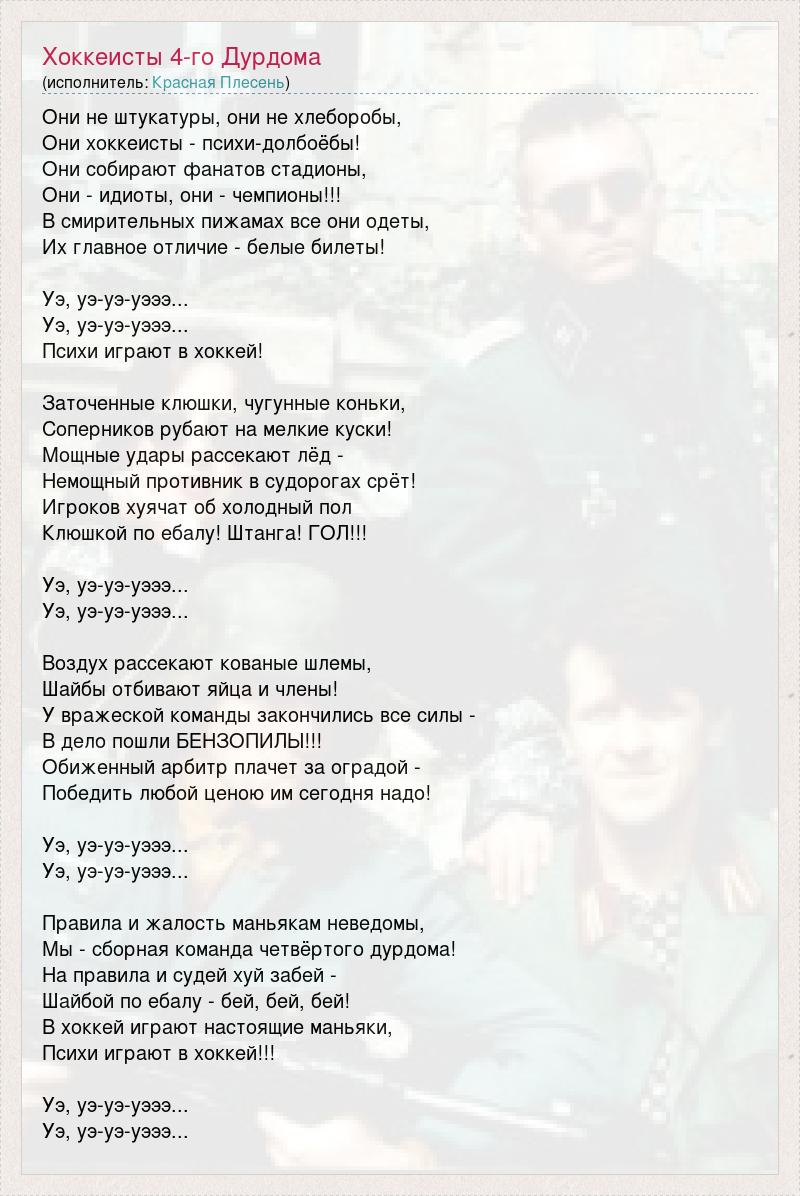 Они не штукатуры, они не хлеборобы, Они хоккеисты - психи-долбоёбы! Они собирают фанатов стадионы, Они - идиоты, они - чемпионы!!! В смирительных пижамах все они одеты, Их главное отличие - белые билеты! Уэ, уэ-уэ-уэээ... Уэ, уэ-уэ-уэээ... Психи играют в хоккей! Заточенные клюшки, чугунные коньки, Соперников рубают на мелкие куски! Мощные удары рассекают лёд - Немощный противник в судорогах срёт! Игроков хуячат об холодный пол Клюшкой по ебалу! Штанга! ГОЛ!!! Уэ, уэ-уэ-уэээ... Уэ, уэ-уэ-уэээ... Воздух рассекают кованые шлемы, Шайбы отбивают яйца и члены! У вражеской команды закончились все силы - В дело пошли БЕНЗОПИЛЫ!!! Обиженный арбитр плачет за оградой - Победить любой ценою им сегодня надо! Уэ, уэ-уэ-уэээ... Уэ, уэ-уэ-уэээ... Правила и жалость маньякам неведомы, Мы - сборная команда четвёртого дурдома! На правила и судей хуй забей - Шайбой по ебалу - бей, бей, бей! В хоккей играют настоящие маньяки, Психи играют в хоккей!!! Уэ, уэ-уэ-уэээ... Уэ, уэ-уэ-уэээ...