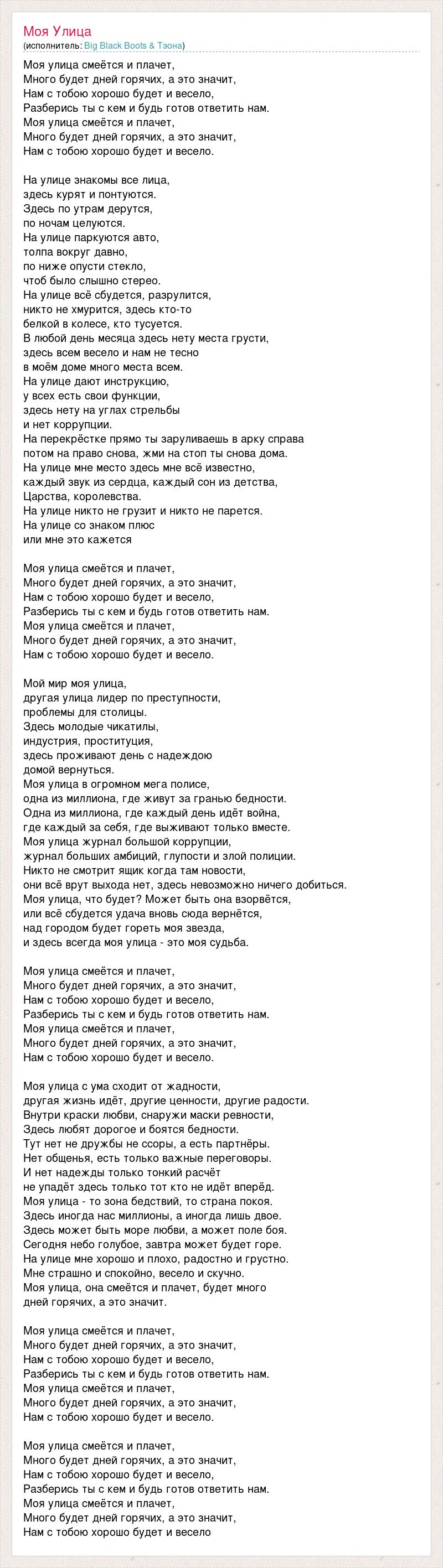 Моя улица смеётся и плачет, Много будет дней горячих, а это значит, Нам с тобою хорошо будет и весело, Разберись ты с кем и будь готов ответить нам. Моя улица смеётся и плачет, Много будет дней горячих, а это значит, Нам с тобою хорошо будет и весело. На улице знакомы все лица, здесь курят и понтуются. Здесь по утрам дерутся, по ночам целуются. На улице паркуются авто, толпа вокруг давно, по ниже опусти стекло, чтоб было слышно стерео. На улице всё сбудется, разрулится, никто не хмурится, здесь кто-то белкой в колесе, кто тусуется. В любой день месяца здесь нету места грусти, здесь всем весело и нам не тесно в моём доме много места всем. На улице дают инструкцию, у всех есть свои функции, здесь нету на углах стрельбы и нет коррупции. На перекрёстке прямо ты заруливаешь в арку справа потом на право снова, жми на стоп ты снова дома. На улице мне место здесь мне всё известно, каждый звук из сердца, каждый сон из детства, Царства, королевства. На улице никто не грузит и никто не парется. На улице со знаком плюс или мне это кажется Моя улица смеётся и плачет, Много будет дней горячих, а это значит, Нам с тобою хорошо будет и весело, Разберись ты с кем и будь готов ответить нам. Моя улица смеётся и плачет, Много будет дней горячих, а это значит, Нам с тобою хорошо будет и весело. Мой мир моя улица, другая улица лидер по преступности, проблемы для столицы. Здесь молодые чикатилы, индустрия, проституция, здесь проживают день с надеждою домой вернуться. Моя улица в огромном мега полисе, одна из миллиона, где живут за гранью бедности. Одна из миллиона, где каждый день идёт война, где каждый за себя, где выживают только вместе. Моя улица журнал большой коррупции, журнал больших амбиций, глупости и злой полиции. Никто не смотрит ящик когда там новости, они всё врут выхода нет, здесь невозможно ничего добиться. Моя улица, что будет? Может быть она взорвётся, или всё сбудется удача вновь сюда вернётся, над городом будет гореть моя звезда, и здесь всегда моя улица - это моя судьба. Моя улица смеётся и плачет, Много будет дней горячих, а это значит, Нам с тобою хорошо будет и весело, Разберись ты с кем и будь готов ответить нам. Моя улица смеётся и плачет, Много будет дней горячих, а это значит, Нам с тобою хорошо будет и весело. Моя улица с ума сходит от жадности, другая жизнь идёт, другие ценности, другие радости. Внутри краски любви, снаружи маски ревности, Здесь любят дорогое и боятся бедности. Тут нет не дружбы не ссоры, а есть партнёры. Нет общенья, есть только важные переговоры. И нет надежды только тонкий расчёт не упадёт здесь только тот кто не идёт вперёд. Моя улица - то зона бедствий, то страна покоя. Здесь иногда нас миллионы, а иногда лишь двое. Здесь может быть море любви, а может поле боя. Сегодня небо голубое, завтра может будет горе. На улице мне хорошо и плохо, радостно и грустно. Мне страшно и спокойно, весело и скучно. Моя улица, она смеётся и плачет, будет много дней горячих, а это значит. Моя улица смеётся и плачет, Много будет дней горячих, а это значит, Нам с тобою хорошо будет и весело, Разберись ты с кем и будь готов ответить нам. Моя улица смеётся и плачет, Много будет дней горячих, а это значит, Нам с тобою хорошо будет и весело. Моя улица смеётся и плачет, Много будет дней горячих, а это значит, Нам с тобою хорошо будет и весело, Разберись ты с кем и будь готов ответить нам. Моя у