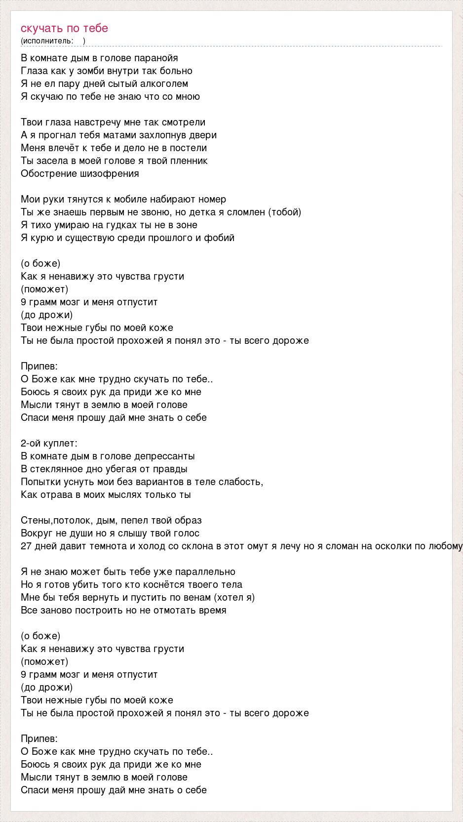 В комнате дым в голове паранойя Глаза как у зомби внутри так больно Я не ел пару дней сытый алкоголем Я скучаю по тебе не знаю что со мною Твои глаза навстречу мне так смотрели А я прогнал тебя матами захлопнув двери Меня влечёт к тебе и дело не в постели Ты засела в моей голове я твой пленник Обострение шизофрения Мои руки тянутся к мобиле набирают номер Ты же знаешь первым не звоню, но детка я сломлен (тобой) Я тихо умираю на гудках ты не в зоне Я курю и существую среди прошлого и фобий (о боже) Как я ненавижу это чувства грусти (поможет) 9 грамм мозг и меня отпустит (до дрожи) Твои нежные губы по моей коже Ты не была простой прохожей я понял это - ты всего дороже Припев: О Боже как мне трудно скучать по тебе.. Боюсь я своих рук да приди же ко мне Мысли тянут в землю в моей голове Спаси меня прошу дай мне знать о себе 2-ой куплет: В комнате дым в голове депрессанты В стеклянное дно убегая от правды Попытки уснуть мои без вариантов в теле слабость, Как отрава в моих мыслях только ты Стены,потолок, дым, пепел твой образ Вокруг не души но я слышу твой голос 27 дней давит темнота и холод со склона в этот омут я лечу но я сломан на осколки по любому Я не знаю может быть тебе уже параллельно Но я готов убить того кто коснётся твоего тела Мне бы тебя вернуть и пустить по венам (хотел я) Все заново построить но не отмотать время (о боже) Как я ненавижу это чувства грусти (поможет) 9 грамм мозг и меня отпустит (до дрожи) Твои нежные губы по моей коже Ты не была простой прохожей я понял это - ты всего дороже Припев: О Боже как мне трудно скучать по тебе.. Боюсь я своих рук да приди же ко мне Мысли тянут в землю в моей голове Спаси меня прошу дай мне знать о себе