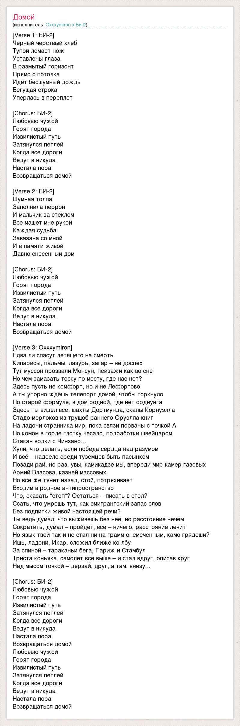 [Verse 1: БИ-2] Черный черствый хлеб Тупой ломает нож Уставлены глаза В размытый горизонт Прямо с потолка Идёт бесшумный дождь Бегущая строка Уперлась в переплет [Chorus: БИ-2] Любовью чужой Горят города Извилистый путь Затянулся петлей Когда все дороги Ведут в никуда Настала пора Возвращаться домой [Verse 2: БИ-2] Шумная толпа Заполнила перрон И мальчик за стеклом Все машет мне рукой Каждая судьба Завязана со мной И в памяти живой Давно снесенный дом [Chorus: БИ-2] Любовью чужой Горят города Извилистый путь Затянулся петлей Когда все дороги Ведут в никуда Настала пора Возвращаться домой [Verse 3: Oxxxymiron] Едва ли спасут летящего на смерть Кипарисы, пальмы, лазурь, загар – не доспех Тут муссон прозвали Монсун, пейзажи как во сне Но чем замазать тоску по месту, где нас нет? Здесь пусть не комфорт, но и не Лефортово А ты упорно ждёшь телепорт домой, чтобы торкнуло По старой формуле, в дом родной, где нет орднунга Здесь ты видел все: шахты Дортмунда, скалы Корнуэлла Стадо морлоков из трущоб раннего Оруэлла книг На ладони странника мир, пока связи порваны с точкой А Но комом в горле глотку чесало, подработки швейцаром Стакан водки с Чинзано… Хули, что делать, если победа сердца над разумом И всё – надоело среди туземцев быть пасынком Позади рай, но раз, увы, камикадзе мы, впереди мир камер газовых Армий Власова, казней массовых Но всё же тянет назад, стой, потряхивает Входим в родное антипространство Что, сказать “стоп”? Остаться – писать в стол? Ссать, что умрешь тут, как эмигрантский запас слов Без подпитки живой настоящей речи? Ты ведь думал, что выживешь без нее, но расстояние нечем Сократить, думал – пройдет, все – ничего, расстояние лечит Но язык твой так и не стал ни на грамм онемеченным, камо грядеши? Ишь, ладони, Икар, сложил ближе ко лбу За спиной – тараканьи бега, Париж и Стамбул Триста коньяка, самолет все выше – и стал вдруг, описав круг Над мысом точкой – дерзай, друг, а там, внизу... [Chorus: БИ-2] Любовью чужой Горят города Извилистый путь Затянулся петлей Когда все дороги Ведут в никуда Настала пора Возвращаться домой Любовью чужой Горят города Извилистый путь Затянулся петлей Когда все дороги Ведут в никуда Настала пора Возвращаться домой