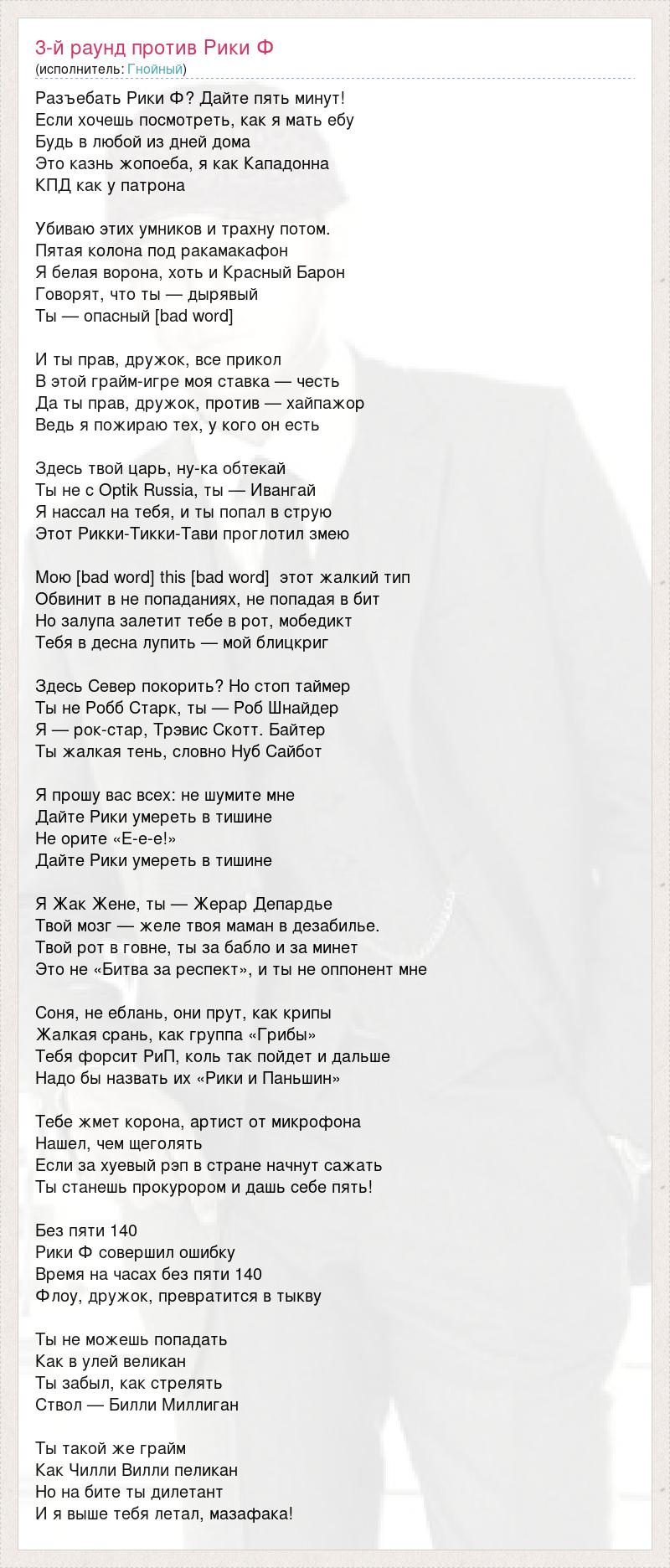 Разъебать Рики Ф? Дайте пять минут! Если хочешь посмотреть, как я мать ебу Будь в любой из дней дома Это казнь жопоеба, я как Кападонна КПД как у патрона Убиваю этих умников и трахну потом. Пятая колона под ракамакафон Я белая ворона, хоть и Красный Барон Говорят, что ты — дырявый Ты — опасный [bad word] И ты прав, дружок, все прикол В этой грайм-игре моя ставка — честь Да ты прав, дружок, против — хайпажор Ведь я пожираю тех, у кого он есть Здесь твой царь, ну-ка обтекай Ты не с Optik Russia, ты — Ивангай Я нассал на тебя, и ты попал в струю Этот Рикки-Тикки-Тави проглотил змею Мою [bad word] this [bad word] этот жалкий тип Обвинит в не попаданиях, не попадая в бит Но залупа залетит тебе в рот, мобедикт Тебя в десна лупить — мой блицкриг Здесь Север покорить? Но стоп таймер Ты не Робб Старк, ты — Роб Шнайдер Я — рок-стар, Трэвис Скотт. Байтер Ты жалкая тень, словно Нуб Сайбот Я прошу вас всех: не шумите мне Дайте Рики умереть в тишине Не орите «Е-е-е!» Дайте Рики умереть в тишине Я Жак Жене, ты — Жерар Депардье Твой мозг — желе твоя маман в дезабилье. Твой рот в говне, ты за бабло и за минет Это не «Битва за респект», и ты не оппонент мне Соня, не еблань, они прут, как крипы Жалкая срань, как группа «Грибы» Тебя форсит РиП, коль так пойдет и дальше Надо бы назвать их «Рики и Паньшин» Тебе жмет корона, артист от микрофона Нашел, чем щеголять Если за хуевый рэп в стране начнут сажать Ты станешь прокурором и дашь себе пять! Без пяти 140 Рики Ф совершил ошибку Время на часах без пяти 140 Флоу, дружок, превратится в тыкву Ты не можешь попадать Как в улей великан Ты забыл, как стрелять Ствол — Билли Миллиган Ты такой же грайм Как Чилли Вилли пеликан Но на бите ты дилетант И я выше тебя летал, мазафака!