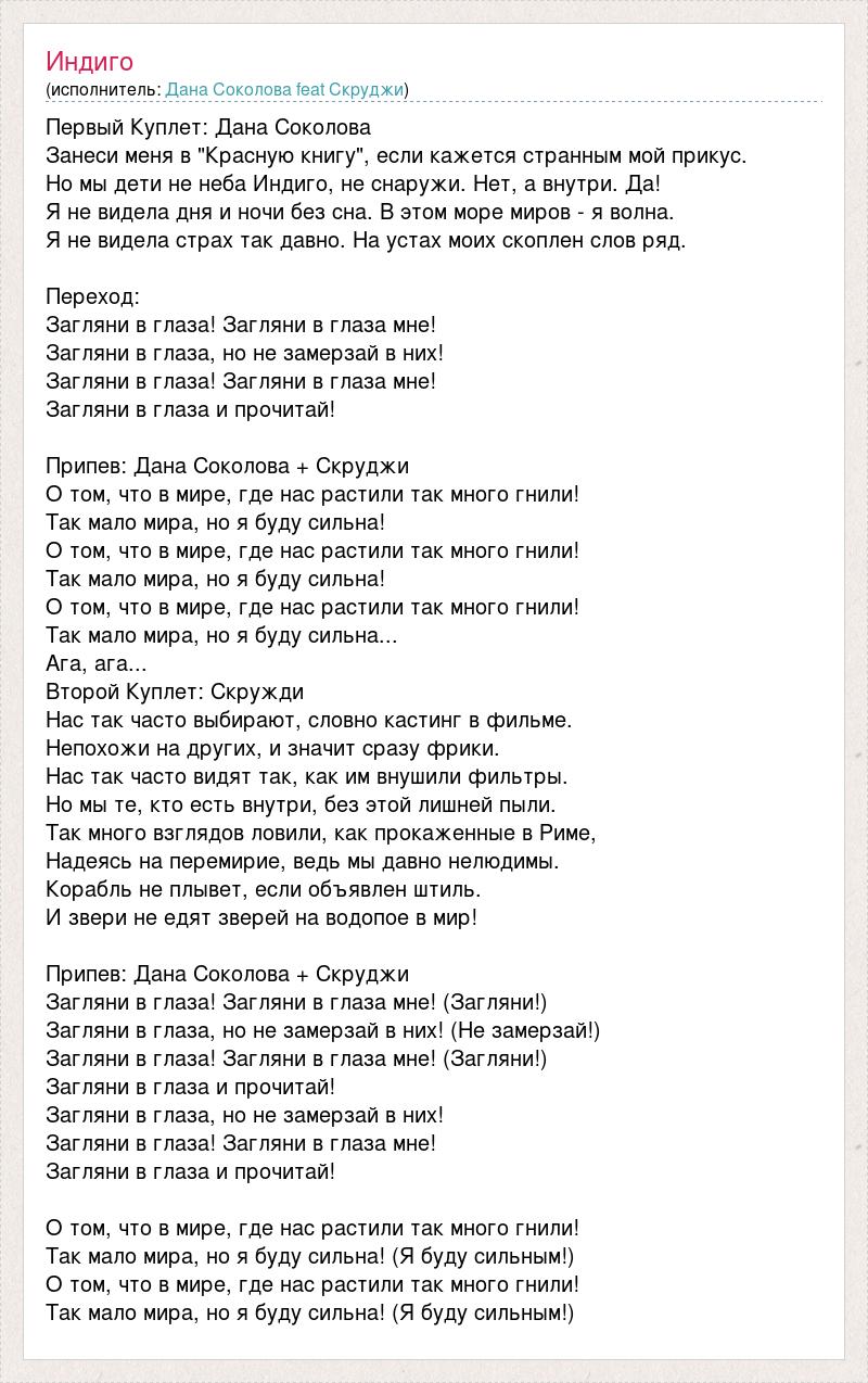 Первый Куплет: Дана Соколова Занеси меня в "Красную книгу", если кажется странным мой прикус. Но мы дети не неба Индиго, не снаружи. Нет, а внутри. Да! Я не видела дня и ночи без сна. В этом море миров - я волна. Я не видела страх так давно. На устах моих скоплен слов ряд. Переход: Загляни в глаза! Загляни в глаза мне! Загляни в глаза, но не замерзай в них! Загляни в глаза! Загляни в глаза мне! Загляни в глаза и прочитай! Припев: Дана Соколова + Скруджи О том, что в мире, где нас растили так много гнили! Так мало мира, но я буду сильна! О том, что в мире, где нас растили так много гнили! Так мало мира, но я буду сильна! О том, что в мире, где нас растили так много гнили! Так мало мира, но я буду сильна... Ага, ага... Второй Куплет: Скружди Нас так часто выбирают, словно кастинг в фильме. Непохожи на других, и значит сразу фрики. Нас так часто видят так, как им внушили фильтры. Но мы те, кто есть внутри, без этой лишней пыли. Так много взглядов ловили, как прокаженные в Риме, Надеясь на перемирие, ведь мы давно нелюдимы. Корабль не плывет, если объявлен штиль. И звери не едят зверей на водопое в мир! Припев: Дана Соколова + Скруджи Загляни в глаза! Загляни в глаза мне! (Загляни!) Загляни в глаза, но не замерзай в них! (Не замерзай!) Загляни в глаза! Загляни в глаза мне! (Загляни!) Загляни в глаза и прочитай! Загляни в глаза, но не замерзай в них! Загляни в глаза! Загляни в глаза мне! Загляни в глаза и прочитай! О том, что в мире, где нас растили так много гнили! Так мало мира, но я буду сильна! (Я буду сильным!) О том, что в мире, где нас растили так много гнили! Так мало мира, но я буду сильна! (Я буду сильным!)