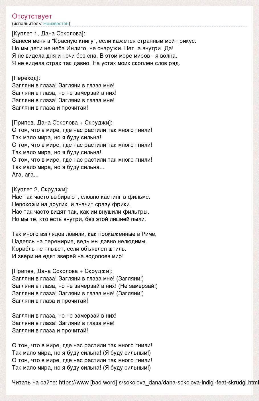 [Куплет 1, Дана Соколова]: Занеси меня в "Красную книгу", если кажется странным мой прикус. Но мы дети не неба Индиго, не снаружи. Нет, а внутри. Да! Я не видела дня и ночи без сна. В этом море миров - я волна. Я не видела страх так давно. На устах моих скоплен слов ряд. [Переход]: Загляни в глаза! Загляни в глаза мне! Загляни в глаза, но не замерзай в них! Загляни в глаза! Загляни в глаза мне! Загляни в глаза и прочитай! [Припев, Дана Соколова + Скруджи]: О том, что в мире, где нас растили так много гнили! Так мало мира, но я буду сильна! О том, что в мире, где нас растили так много гнили! Так мало мира, но я буду сильна! О том, что в мире, где нас растили так много гнили! Так мало мира, но я буду сильна... Ага, ага... [Куплет 2, Скруджи]: Нас так часто выбирают, словно кастинг в фильме. Непохожи на других, и значит сразу фрики. Нас так часто видят так, как им внушили фильтры. Но мы те, кто есть внутри, без этой лишней пыли. Так много взглядов ловили, как прокаженные в Риме, Надеясь на перемирие, ведь мы давно нелюдимы. Корабль не плывет, если объявлен штиль. И звери не едят зверей на водопоев мир! [Припев, Дана Соколова + Скруджи]: Загляни в глаза! Загляни в глаза мне! (Загляни!) Загляни в глаза, но не замерзай в них! (Не замерзай!) Загляни в глаза! Загляни в глаза мне! (Загляни!) Загляни в глаза и прочитай! Загляни в глаза, но не замерзай в них! Загляни в глаза! Загляни в глаза мне! Загляни в глаза и прочитай! О том, что в мире, где нас растили так много гнили! Так мало мира, но я буду сильна! (Я буду сильным!) О том, что в мире, где нас растили так много гнили! Так мало мира, но я буду сильна! (Я буду сильным!) Читать на сайте: https://www [bad word] s/sokolova_dana/dana-sokolova-indigi-feat-skrudgi.html