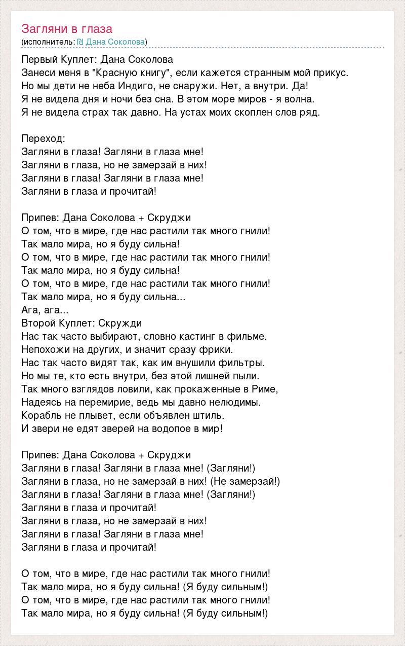 Первый Куплет: Дана Соколова Занеси меня в "Красную книгу", если кажется странным мой прикус. Но мы дети не неба Индиго, не снаружи. Нет, а внутри. Да! Я не видела дня и ночи без сна. В этом море миров - я волна. Я не видела страх так давно. На устах моих скоплен слов ряд. Переход: Загляни в глаза! Загляни в глаза мне! Загляни в глаза, но не замерзай в них! Загляни в глаза! Загляни в глаза мне! Загляни в глаза и прочитай! Припев: Дана Соколова + Скруджи О том, что в мире, где нас растили так много гнили! Так мало мира, но я буду сильна! О том, что в мире, где нас растили так много гнили! Так мало мира, но я буду сильна! О том, что в мире, где нас растили так много гнили! Так мало мира, но я буду сильна... Ага, ага... Второй Куплет: Скружди Нас так часто выбирают, словно кастинг в фильме. Непохожи на других, и значит сразу фрики. Нас так часто видят так, как им внушили фильтры. Но мы те, кто есть внутри, без этой лишней пыли. Так много взглядов ловили, как прокаженные в Риме, Надеясь на перемирие, ведь мы давно нелюдимы. Корабль не плывет, если объявлен штиль. И звери не едят зверей на водопое в мир! Припев: Дана Соколова + Скруджи Загляни в глаза! Загляни в глаза мне! (Загляни!) Загляни в глаза, но не замерзай в них! (Не замерзай!) Загляни в глаза! Загляни в глаза мне! (Загляни!) Загляни в глаза и прочитай! Загляни в глаза, но не замерзай в них! Загляни в глаза! Загляни в глаза мне! Загляни в глаза и прочитай! О том, что в мире, где нас растили так много гнили! Так мало мира, но я буду сильна! (Я буду сильным!) О том, что в мире, где нас растили так много гнили! Так мало мира, но я буду сильна! (Я буду сильным!)