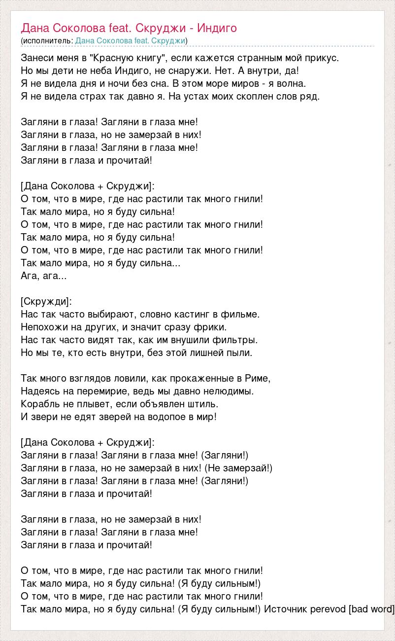 Занеси меня в "Красную книгу", если кажется странным мой прикус. Но мы дети не неба Индиго, не снаружи. Нет. А внутри, да! Я не видела дня и ночи без сна. В этом море миров - я волна. Я не видела страх так давно я. На устах моих скоплен слов ряд. Загляни в глаза! Загляни в глаза мне! Загляни в глаза, но не замерзай в них! Загляни в глаза! Загляни в глаза мне! Загляни в глаза и прочитай! [Дана Соколова + Скруджи]: О том, что в мире, где нас растили так много гнили! Так мало мира, но я буду сильна! О том, что в мире, где нас растили так много гнили! Так мало мира, но я буду сильна! О том, что в мире, где нас растили так много гнили! Так мало мира, но я буду сильна... Ага, ага... [Скружди]: Нас так часто выбирают, словно кастинг в фильме. Непохожи на других, и значит сразу фрики. Нас так часто видят так, как им внушили фильтры. Но мы те, кто есть внутри, без этой лишней пыли. Так много взглядов ловили, как прокаженные в Риме, Надеясь на перемирие, ведь мы давно нелюдимы. Корабль не плывет, если объявлен штиль. И звери не едят зверей на водопое в мир! [Дана Соколова + Скруджи]: Загляни в глаза! Загляни в глаза мне! (Загляни!) Загляни в глаза, но не замерзай в них! (Не замерзай!) Загляни в глаза! Загляни в глаза мне! (Загляни!) Загляни в глаза и прочитай! Загляни в глаза, но не замерзай в них! Загляни в глаза! Загляни в глаза мне! Загляни в глаза и прочитай! О том, что в мире, где нас растили так много гнили! Так мало мира, но я буду сильна! (Я буду сильным!) О том, что в мире, где нас растили так много гнили! Так мало мира, но я буду сильна! (Я буду сильным!) Источник perevod [bad word]