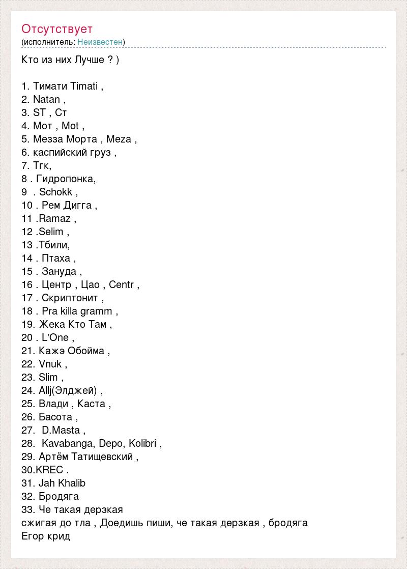 Кто из них Лучше ? ) 1. Тимати Timati , 2. Natan , 3. ST , Ст 4. Мот , Mot , 5. Мезза Морта , Meza , 6. каспийский груз , 7. Тгк, 8 . Гидропонка, 9 . Schokk , 10 . Рем Дигга , 11 .Ramaz , 12 .Selim , 13 .Тбили, 14 . Птаха , 15 . Зануда , 16 . Центр , Цао , Centr , 17 . Скриптонит , 18 . Pra killa gramm , 19. Жека Кто Там , 20 . L'One , 21. Кажэ Обойма , 22. Vnuk , 23. Slim , 24. Allj(Элджей) , 25. Влади , Каста , 26. Басота , 27. D.Masta , 28. Kavabanga, Depo, Kolibri , 29. Артём Татищевский , 30.KREC . 31. Jah Khalib 32. Бродяга 33. Че такая дерзкая сжигая до тла , Доедишь пиши, че такая дерзкая , бродяга Егор крид