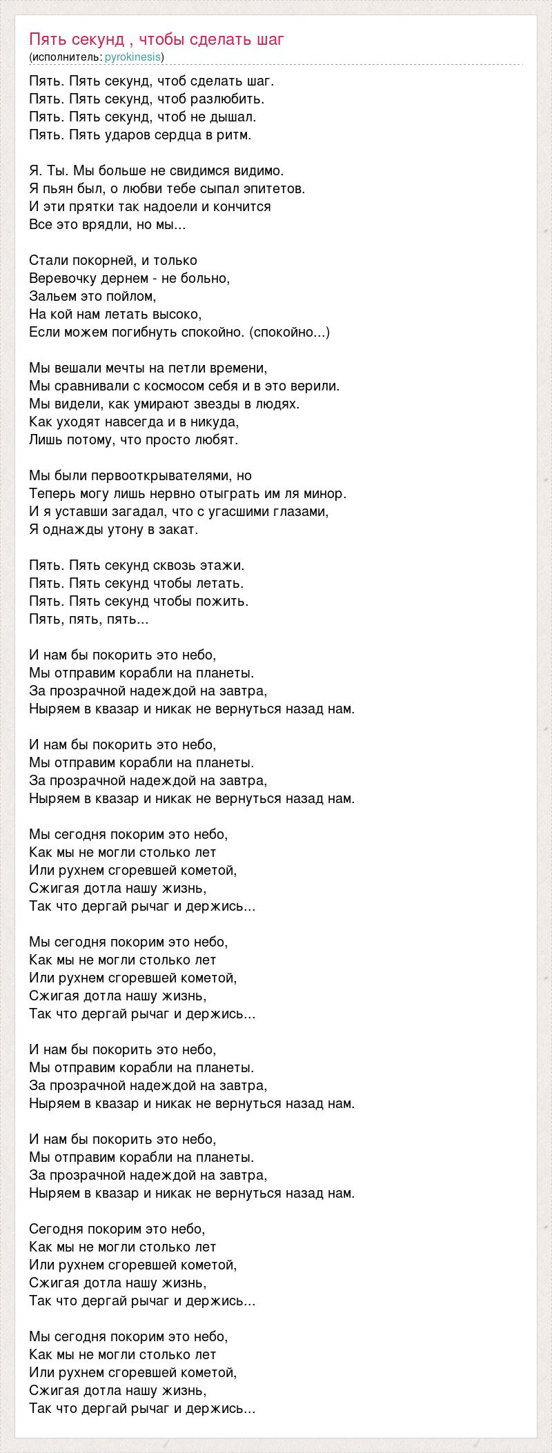 Пять. Пять секунд, чтоб сделать шаг. Пять. Пять секунд, чтоб разлюбить. Пять. Пять секунд, чтоб не дышал. Пять. Пять ударов сердца в ритм. Я. Ты. Мы больше не свидимся видимо. Я пьян был, о любви тебе сыпал эпитетов. И эти прятки так надоели и кончится Все это врядли, но мы... Стали покорней, и только Веревочку дернем - не больно, Зальем это пойлом, На кой нам летать высоко, Если можем погибнуть спокойно. (спокойно...) Мы вешали мечты на петли времени, Мы сравнивали с космосом себя и в это верили. Мы видели, как умирают звезды в людях. Как уходят навсегда и в никуда, Лишь потому, что просто любят. Мы были первооткрывателями, но Теперь могу лишь нервно отыграть им ля минор. И я уставши загадал, что с угасшими глазами, Я однажды утону в закат. Пять. Пять секунд сквозь этажи. Пять. Пять секунд чтобы летать. Пять. Пять секунд чтобы пожить. Пять, пять, пять... И нам бы покорить это небо, Мы отправим корабли на планеты. За прозрачной надеждой на завтра, Ныряем в квазар и никак не вернуться назад нам. И нам бы покорить это небо, Мы отправим корабли на планеты. За прозрачной надеждой на завтра, Ныряем в квазар и никак не вернуться назад нам. Мы сегодня покорим это небо, Как мы не могли столько лет Или рухнем сгоревшей кометой, Сжигая дотла нашу жизнь, Так что дергай рычаг и держись... Мы сегодня покорим это небо, Как мы не могли столько лет Или рухнем сгоревшей кометой, Сжигая дотла нашу жизнь, Так что дергай рычаг и держись... И нам бы покорить это небо, Мы отправим корабли на планеты. За прозрачной надеждой на завтра, Ныряем в квазар и никак не вернуться назад нам. И нам бы покорить это небо, Мы отправим корабли на планеты. За прозрачной надеждой на завтра, Ныряем в квазар и никак не вернуться назад нам. Сегодня покорим это небо, Как мы не могли столько лет Или рухнем сгоревшей кометой, Сжигая дотла нашу жизнь, Так что дергай рычаг и держись... Мы сегодня покорим это небо, Как мы не могли столько лет Или рухнем сгоревшей кометой, Сжигая дотла нашу жизнь, Так что дергай рычаг и держись...