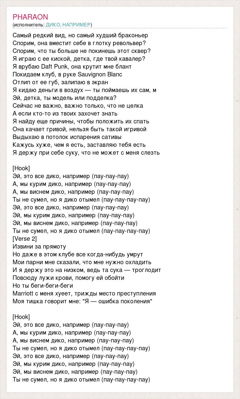 Самый редкий вид, но самый худший браконьер Спорим, она вместит себе в глотку револьвер? Спорим, что ты больше не покинешь этот сквер? Я играю с ее киской, детка, где твой кавалер? Я врубаю Daft Punk, она крутит мне блант Покидаем клуб, в руке Sauvignon Blanc Отлип от ее губ, залипаю в экран Я кидаю деньги в воздух — ты поймаешь их сам, м Эй, детка, ты модель или подделка? Сейчас не важно, важно только, что не целка А если кто-то из твоих захочет знать Я найду еще причины, чтобы положить их спать Она качает гривой, нельзя быть такой игривой Выдыхаю в потолок испарения сативы Кажусь хуже, чем я есть, заставляю тебя есть Я держу при себе суку, что не может с меня слезть [Hook] Эй, это все дико, например (пау-пау-пау) А, мы курим дико, например (пау-пау-пау) А, мы виснем дико, например (пау-пау-пау) Ты не сумел, но я дико отымел (пау-пау-пау-пау) Эй, это все дико, например (пау-пау-пау) Эй, мы курим дико, например (пау-пау-пау) Эй, мы виснем дико, например (пау-пау-пау) Ты не сумел, но я дико отымел (пау-пау-пау-пау) [Verse 2] Извини за прямоту Но даже в этом клубе все когда-нибудь умрут Мои парни мне сказали, что мне нужно охладить И я держу это на низком, ведь та сука — троглодит Повсюду лужи крови, помогу ей обойти Но ты беги-беги-беги Marriott с меня хуеет, трижды место преступления Моя тишка говорит мне: "Я — ошибка поколения" [Hook] Эй, это все дико, например (пау-пау-пау) А, мы курим дико, например (пау-пау-пау) А, мы виснем дико, например (пау-пау-пау) Ты не сумел, но я дико отымел (пау-пау-пау-пау) Эй, это все дико, например (пау-пау-пау) Эй, мы курим дико, например (пау-пау-пау) Эй, мы виснем дико, например (пау-пау-пау) Ты не сумел, но я дико отымел (пау-пау-пау-пау)