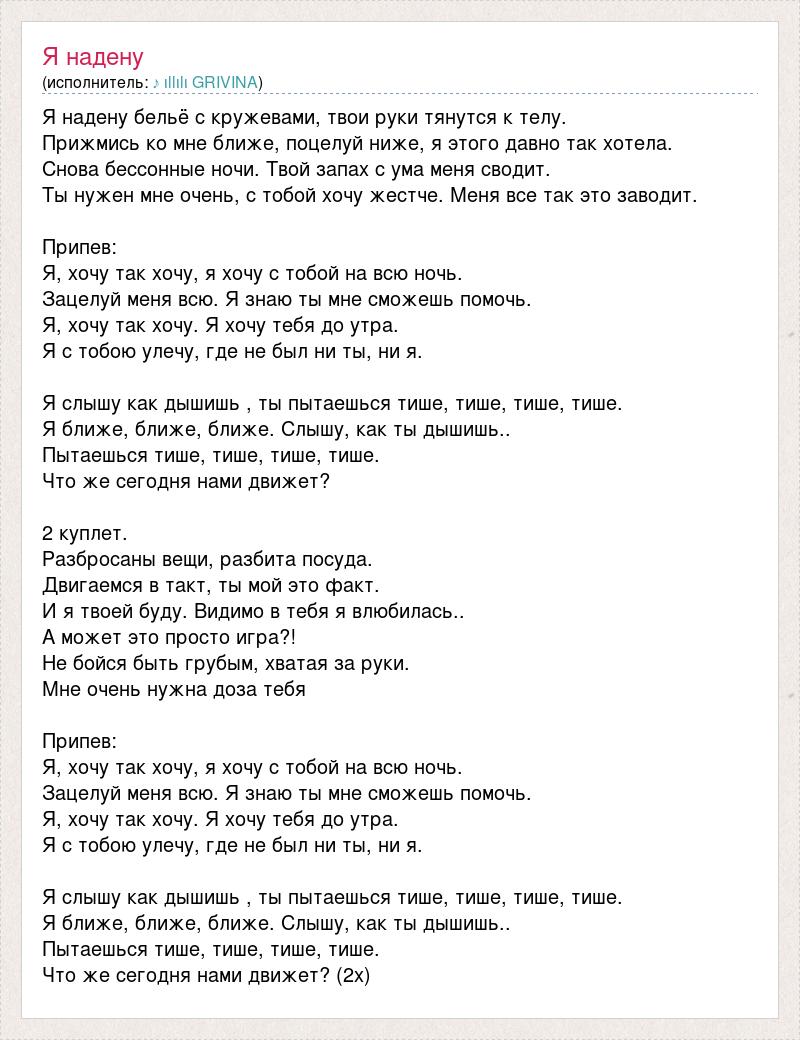 Я надену бельё с кружевами, твои руки тянутся к телу. Прижмись ко мне ближе, поцелуй ниже, я этого давно так хотела. Снова бессонные ночи. Твой запах с ума меня сводит. Ты нужен мне очень, с тобой хочу жестче. Меня все так это заводит. Припев: Я, хочу так хочу, я хочу с тобой на всю ночь. Зацелуй меня всю. Я знаю ты мне сможешь помочь. Я, хочу так хочу. Я хочу тебя до утра. Я с тобою улечу, где не был ни ты, ни я. Я слышу как дышишь , ты пытаешься тише, тише, тише, тише. Я ближе, ближе, ближе. Слышу, как ты дышишь.. Пытаешься тише, тише, тише, тише. Что же сегодня нами движет? 2 куплет. Разбросаны вещи, разбита посуда. Двигаемся в такт, ты мой это факт. И я твоей буду. Видимо в тебя я влюбилась.. А может это просто игра?! Не бойся быть грубым, хватая за руки. Мне очень нужна доза тебя Припев: Я, хочу так хочу, я хочу с тобой на всю ночь. Зацелуй меня всю. Я знаю ты мне сможешь помочь. Я, хочу так хочу. Я хочу тебя до утра. Я с тобою улечу, где не был ни ты, ни я. Я слышу как дышишь , ты пытаешься тише, тише, тише, тише. Я ближе, ближе, ближе. Слышу, как ты дышишь.. Пытаешься тише, тише, тише, тише. Что же сегодня нами движет? (2х)