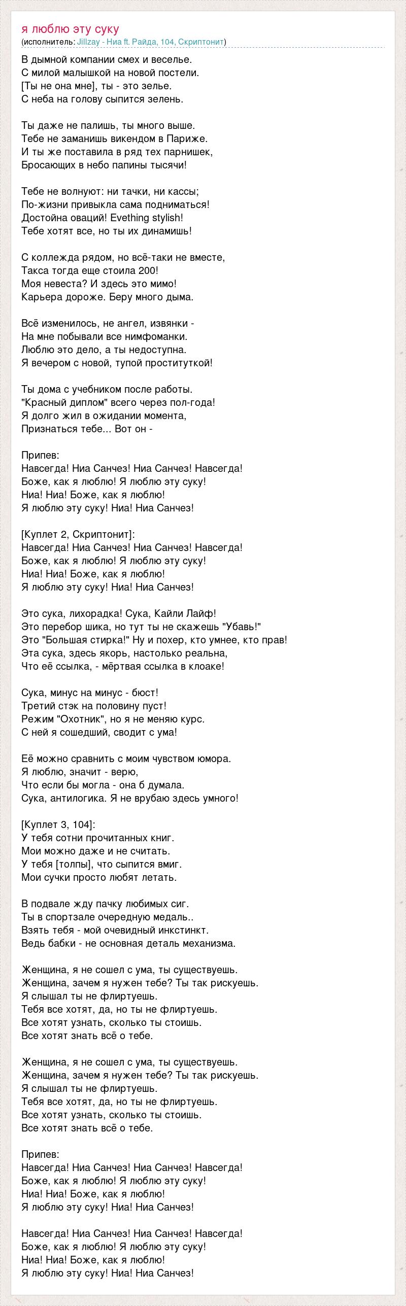 В дымной компании смех и веселье. С милой малышкой на новой постели. [Ты не она мне], ты - это зелье. С неба на голову сыпится зелень. Ты даже не палишь, ты много выше. Тебе не заманишь викендом в Париже. И ты же поставила в ряд тех парнишек, Бросающих в небо папины тысячи! Тебе не волнуют: ни тачки, ни кассы; По-жизни привыкла сама подниматься! Достойна оваций! Evething stylish! Тебе хотят все, но ты их динамишь! С коллежда рядом, но всё-таки не вместе, Такса тогда еще стоила 200! Моя невеста? И здесь это мимо! Карьера дороже. Беру много дыма. Всё изменилось, не ангел, извянки - На мне побывали все нимфоманки. Люблю это дело, а ты недоступна. Я вечером с новой, тупой проституткой! Ты дома с учебником после работы. "Красный диплом" всего через пол-года! Я долго жил в ожидании момента, Признаться тебе... Вот он - Припев: Навсегда! Ниа Санчез! Ниа Санчез! Навсегда! Боже, как я люблю! Я люблю эту суку! Ниа! Ниа! Боже, как я люблю! Я люблю эту суку! Ниа! Ниа Санчез! [Куплет 2, Скриптонит]: Навсегда! Ниа Санчез! Ниа Санчез! Навсегда! Боже, как я люблю! Я люблю эту суку! Ниа! Ниа! Боже, как я люблю! Я люблю эту суку! Ниа! Ниа Санчез! Это сука, лихорадка! Сука, Кайли Лайф! Это перебор шика, но тут ты не скажешь "Убавь!" Это "Большая стирка!" Ну и похер, кто умнее, кто прав! Эта сука, здесь якорь, настолько реальна, Что её ссылка, - мёртвая ссылка в клоаке! Сука, минус на минус - бюст! Третий стэк на половину пуст! Режим "Охотник", но я не меняю курс. С ней я сошедший, сводит с ума! Её можно сравнить с моим чувством юмора. Я люблю, значит - верю, Что если бы могла - она б думала. Сука, антилогика. Я не врубаю здесь умного! [Куплет 3, 104]: У тебя сотни прочитанных книг. Мои можно даже и не считать. У тебя [толпы], что сыпится вмиг. Мои сучки просто любят летать. В подвале жду пачку любимых сиг. Ты в спортзале очередную медаль.. Взять тебя - мой очевидный инкстинкт. Ведь бабки - не основная деталь механизма. Женщина, я не сошел с ума, ты существуешь. Женщина, зачем я нужен тебе? Ты так рискуешь. Я слышал ты не флиртуешь. Тебя все хотят, да, но ты не флиртуешь. Все хотят узнать, сколько ты стоишь. Все хотят знать всё о тебе. Женщина, я не сошел с ума, ты существуешь. Женщина, зачем я нужен тебе? Ты так рискуешь. Я слышал ты не флиртуешь. Тебя все хотят, да, но ты не флиртуешь. Все хотят узнать, сколько ты стоишь. Все хотят знать всё о тебе. Припев: Навсегда! Ниа Санчез! Ниа Санчез! Навсегда! Боже, как я люблю! Я люблю эту суку! Ниа! Ниа! Боже, как я люблю! Я люблю эту суку! Ниа! Ниа Санчез! Навсегда! Ниа Санчез! Ниа Санчез! Навсегда! Боже, как я люблю! Я люблю эту суку! Ниа! Ниа! Боже, как я люблю! Я люблю эту суку! Ниа! Ниа Санчез!