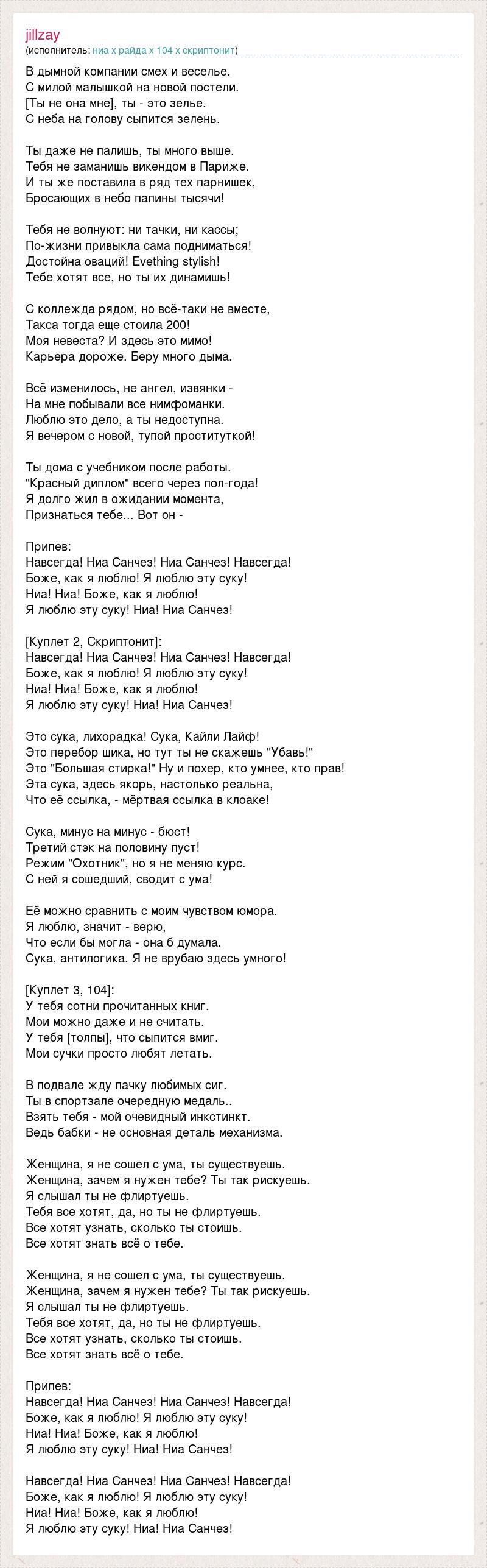 В дымной компании смех и веселье. С милой малышкой на новой постели. [Ты не она мне], ты - это зелье. С неба на голову сыпится зелень. Ты даже не палишь, ты много выше. Тебя не заманишь викендом в Париже. И ты же поставила в ряд тех парнишек, Бросающих в небо папины тысячи! Тебя не волнуют: ни тачки, ни кассы; По-жизни привыкла сама подниматься! Достойна оваций! Evething stylish! Тебе хотят все, но ты их динамишь! С коллежда рядом, но всё-таки не вместе, Такса тогда еще стоила 200! Моя невеста? И здесь это мимо! Карьера дороже. Беру много дыма. Всё изменилось, не ангел, извянки - На мне побывали все нимфоманки. Люблю это дело, а ты недоступна. Я вечером с новой, тупой проституткой! Ты дома с учебником после работы. "Красный диплом" всего через пол-года! Я долго жил в ожидании момента, Признаться тебе... Вот он - Припев: Навсегда! Ниа Санчез! Ниа Санчез! Навсегда! Боже, как я люблю! Я люблю эту суку! Ниа! Ниа! Боже, как я люблю! Я люблю эту суку! Ниа! Ниа Санчез! [Куплет 2, Скриптонит]: Навсегда! Ниа Санчез! Ниа Санчез! Навсегда! Боже, как я люблю! Я люблю эту суку! Ниа! Ниа! Боже, как я люблю! Я люблю эту суку! Ниа! Ниа Санчез! Это сука, лихорадка! Сука, Кайли Лайф! Это перебор шика, но тут ты не скажешь "Убавь!" Это "Большая стирка!" Ну и похер, кто умнее, кто прав! Эта сука, здесь якорь, настолько реальна, Что её ссылка, - мёртвая ссылка в клоаке! Сука, минус на минус - бюст! Третий стэк на половину пуст! Режим "Охотник", но я не меняю курс. С ней я сошедший, сводит с ума! Её можно сравнить с моим чувством юмора. Я люблю, значит - верю, Что если бы могла - она б думала. Сука, антилогика. Я не врубаю здесь умного! [Куплет 3, 104]: У тебя сотни прочитанных книг. Мои можно даже и не считать. У тебя [толпы], что сыпится вмиг. Мои сучки просто любят летать. В подвале жду пачку любимых сиг. Ты в спортзале очередную медаль.. Взять тебя - мой очевидный инкстинкт. Ведь бабки - не основная деталь механизма. Женщина, я не сошел с ума, ты существуешь. Женщина, зачем я нужен тебе? Ты так рискуешь. Я слышал ты не флиртуешь. Тебя все хотят, да, но ты не флиртуешь. Все хотят узнать, сколько ты стоишь. Все хотят знать всё о тебе. Женщина, я не сошел с ума, ты существуешь. Женщина, зачем я нужен тебе? Ты так рискуешь. Я слышал ты не флиртуешь. Тебя все хотят, да, но ты не флиртуешь. Все хотят узнать, сколько ты стоишь. Все хотят знать всё о тебе. Припев: Навсегда! Ниа Санчез! Ниа Санчез! Навсегда! Боже, как я люблю! Я люблю эту суку! Ниа! Ниа! Боже, как я люблю! Я люблю эту суку! Ниа! Ниа Санчез! Навсегда! Ниа Санчез! Ниа Санчез! Навсегда! Боже, как я люблю! Я люблю эту суку! Ниа! Ниа! Боже, как я люблю! Я люблю эту суку! Ниа! Ниа Санчез!