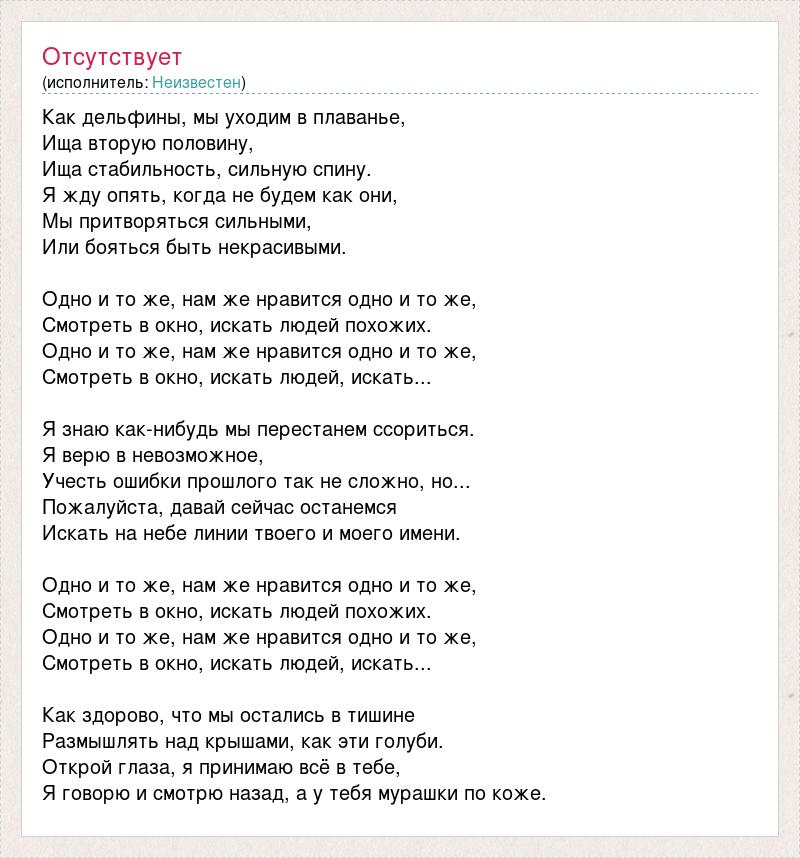 Как дельфины, мы уходим в плаванье, Ища вторую половину, Ища стабильность, сильную спину. Я жду опять, когда не будем как они, Мы притворяться сильными, Или бояться быть некрасивыми. Одно и то же, нам же нравится одно и то же, Смотреть в окно, искать людей похожих. Одно и то же, нам же нравится одно и то же, Смотреть в окно, искать людей, искать... Я знаю как-нибудь мы перестанем ссориться. Я верю в невозможное, Учесть ошибки прошлого так не сложно, но... Пожалуйста, давай сейчас останемся Искать на небе линии твоего и моего имени. Одно и то же, нам же нравится одно и то же, Смотреть в окно, искать людей похожих. Одно и то же, нам же нравится одно и то же, Смотреть в окно, искать людей, искать... Как здорово, что мы остались в тишине Размышлять над крышами, как эти голуби. Открой глаза, я принимаю всё в тебе, Я говорю и смотрю назад, а у тебя мурашки по коже.