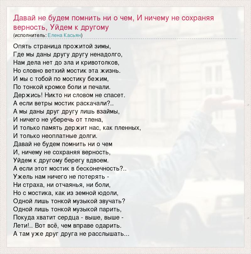 Опять страница прожитой зимы, Где мы даны другу другу ненадолго, Нам дела нет до зла и кривотолков, Но словно ветхий мостик эта жизнь. И мы с тобой по мостику бежим, По тонкой кромке боли и печали. Держись! Никто ни словом не спасет. А если ветры мостик раскачали?.. А мы даны друг другу лишь взаймы, И ничего не уберечь от тлена, И только память держит нас, как пленных, И только неоплатные долги. Давай не будем помнить ни о чем И, ничему не сохраняя верность, Уйдем к другому берегу вдвоем. А если этот мостик в бесконечность?.. Ужель нам ничего не потерять - Ни страха, ни отчаянья, ни боли, Но с мостика, как из земной юдоли, Одной лишь тонкой музыкой звучать? Одной лишь тонкой музыкой парить, Покуда хватит сердца - выше, выше - Лети!.. Вот всё, чем вправе одарить. А там уже друг друга не расслышать...
