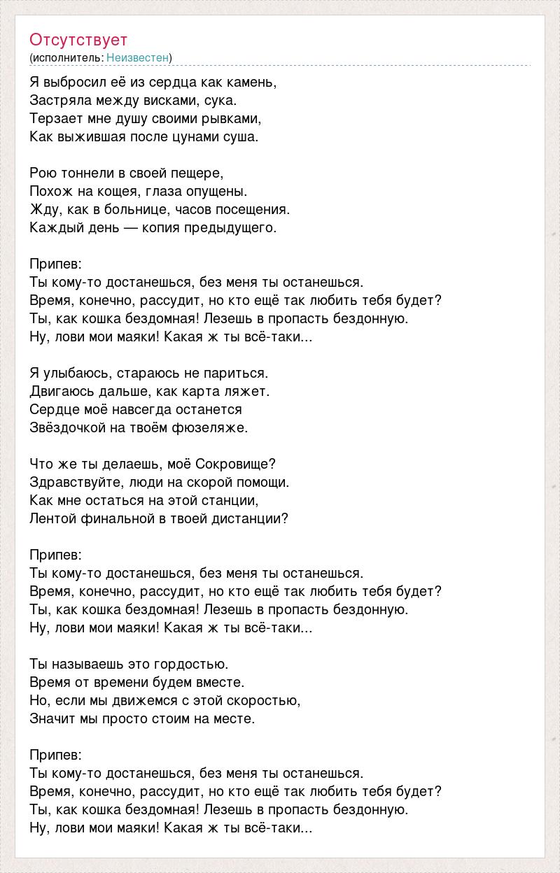 Я выбросил её из сердца как камень, Застряла между висками, сука. Терзает мне душу своими рывками, Как выжившая после цунами суша. Рою тоннели в своей пещере, Похож на кощея, глаза опущены. Жду, как в больнице, часов посещения. Каждый день — копия предыдущего. Припев: Ты кому-то достанешься, без меня ты останешься. Время, конечно, рассудит, но кто ещё так любить тебя будет? Ты, как кошка бездомная! Лезешь в пропасть бездонную. Ну, лови мои маяки! Какая ж ты всё-таки... Я улыбаюсь, стараюсь не париться. Двигаюсь дальше, как карта ляжет. Сердце моё навсегда останется Звёздочкой на твоём фюзеляже. Что же ты делаешь, моё Сокровище? Здравствуйте, люди на скорой помощи. Как мне остаться на этой станции, Лентой финальной в твоей дистанции? Припев: Ты кому-то достанешься, без меня ты останешься. Время, конечно, рассудит, но кто ещё так любить тебя будет? Ты, как кошка бездомная! Лезешь в пропасть бездонную. Ну, лови мои маяки! Какая ж ты всё-таки... Ты называешь это гордостью. Время от времени будем вместе. Но, если мы движемся с этой скоростью, Значит мы просто стоим на месте. Припев: Ты кому-то достанешься, без меня ты останешься. Время, конечно, рассудит, но кто ещё так любить тебя будет? Ты, как кошка бездомная! Лезешь в пропасть бездонную. Ну, лови мои маяки! Какая ж ты всё-таки...