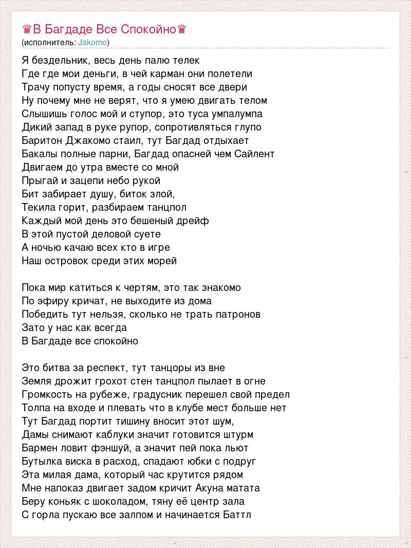 Я бездельник, весь день палю телек Где где мои деньги, в чей карман они полетели Трачу попусту время, а годы сносят все двери Ну почему мне не верят, что я умею двигать телом Слышишь голос мой и ступор, это туса умпалумпа Дикий запад в руке рупор, сопротивляться глупо Баритон Джакомо стаил, тут Багдад отдыхает Бакалы полные парни, Багдад опасней чем Сайлент Двигаем до утра вместе со мной Прыгай и зацепи небо рукой Бит забирает душу, биток злой, Текила горит, разбираем танцпол Каждый мой день это бешеный дрейф В этой пустой деловой суете А ночью качаю всех кто в игре Наш островок среди этих морей Пока мир катиться к чертям, это так знакомо По эфиру кричат, не выходите из дома Победить тут нельзя, сколько не трать патронов Зато у нас как всегда В Багдаде все спокойно Это битва за респект, тут танцоры из вне Земля дрожит грохот стен танцпол пылает в огне Громкость на рубеже, градусник перешел свой предел Толпа на входе и плевать что в клубе мест больше нет Тут Багдад портит тишину вносит этот шум, Дамы снимают каблуки значит готовится штурм Бармен ловит фэншуй, а значит пей пока льют Бутылка виска в расход, спадают юбки с подруг Эта милая дама, который час крутится рядом Мне напоказ двигает задом кричит Акуна матата Беру коньяк с шоколадом, тяну её центр зала С горла пускаю все залпом и начинается Баттл