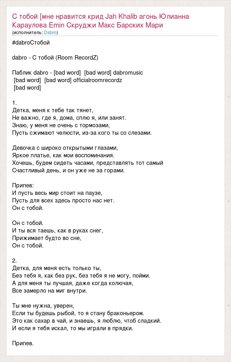 #dabroСтобой dabro - С тобой (Room RecordZ) Паблик dabro - [bad word] [bad word] dabromusic [bad word] [bad word] officialroomrecordz [bad word] 1. Детка, меня к тебе так тянет, Не важно, где я, дома, сплю я, или занят. Знаю, у меня не очень с тормозами, Пусть сжимают челюсти, из-за кого ты со слезами. Девочка с широко открытыми глазами, Яркое платье, как мои воспоминания. Хочешь, будем сидеть часами, представлять тот самый Счастливый день, и он уже не за горами. Припев: И пусть весь мир стоит на паузе, Пусть для всех здесь просто нас нет. Он с тобой. Он с тобой. И ты вся таешь, как в руках снег, Прижимает будто во сне, Он с тобой. 2. Детка, для меня есть только ты, Без тебя я, как без рук, без тебя я не могу, пойми. А для меня ты лучшая, даже когда колючая, Все замерло на миг внутри. Ты мне нужна, уверен, Если ты будешь рыбой, то я стану браконьером. Это как сахар в чай, и знаешь, я люблю, чтоб сладкий. И если я тебя искал, то мы играли в прядки. Припев.