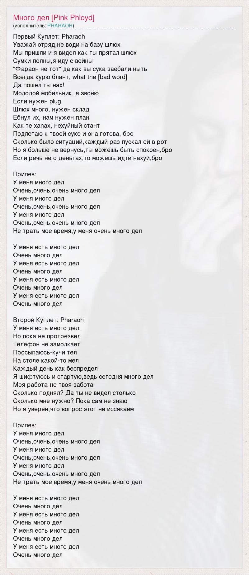 Первый Куплет: Pharaoh Уважай отряд,не води на базу шлюх Мы пришли и я видел как ты прятал шлюх Сумки полны,я иду с войны "Фараон не тот" да как вы сука заебали ныть Всегда курю блант, what the [bad word] Да пошел ты нах! Молодой мобильник, я звоню Если нужен plug Шлюх много, нужен склад Ебнул их, нам нужен план Как те xanax, нехуйный стант Подлетаю к твоей суке и она готова, бро Сколько было ситуаций,каждый раз пускал ей в рот Но я больше не вернусь,ты можешь быть спокоен,бро Если речь не о деньгах,то можешь идти нахуй,бро Припев: У меня много дел Очень,очень,очень много дел У меня много дел Очень,очень,очень много дел У меня много дел Очень,очень,очень много дел Не трать мое время,у меня очень много дел У меня есть много дел Очень много дел У меня есть много дел Очень много дел У меня есть много дел Очень много дел У меня есть много дел Очень много дел Второй Куплет: Pharaoh У меня есть много дел, Но пока не протрезвел Телефон не замолкает Просыпаюсь-кучи тел На столе какой-то мел Каждый день как беспредел Я шифтуюсь и стартую,ведь сегодня много дел Моя работа-не твоя забота Сколько поднял? Да ты не видел столько Сколько мне нужно? Пока сам не знаю Но я уверен,что вопрос этот не иссякаем Припев: У меня много дел Очень,очень,очень много дел У меня много дел Очень,очень,очень много дел У меня много дел Очень,очень,очень много дел Не трать мое время,у меня очень много дел У меня есть много дел Очень много дел У меня есть много дел Очень много дел У меня есть много дел Очень много дел У меня есть много дел Очень много дел