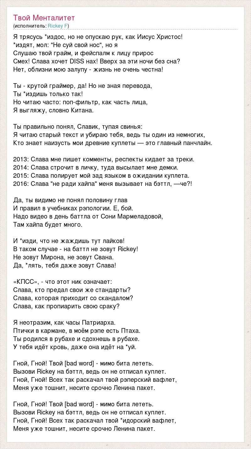 Я трясусь *издос, но не опускаю рук, как Иисус Христос! *издят, мол: "Не суй свой нос", но я Слушаю твой грайм, и фейспалм к лицу прирос Смех! Слава хочет DISS нах! Вверх за эти ночи без сна? Нет, облизни мою залупу - жизнь не очень честна! Ты - крутой граймер, да! Но не зная перевода, Ты *издишь только так! Но читаю часто: поп-фильтр, как часть лица, Я выгляжу, словно Китана. Ты правильно понял, Славик, тупая свинья: Я читаю старый текст и убираю тебя, ведь ты один из немногих, Кто знает наизусть мои древние куплеты — это главный панчлайн. 2013: Слава мне пишет комменты, респекты кидает за треки. 2014: Слава строчит в личку, туда высылает мне демки. 2015: Слава полирует мой зад языком в ожидании куплета. 2016: Слава "не ради хайпа" меня вызывает на бэттл, —че?! Да, ты видимо не понял половину глав И правил в учебниках рэпологии. Е, бой. Надо видео в день баттла от Сони Мармеладовой, Там хайпа будет много. И *изди, что не жаждишь тут лайков! В таком случае - на баттл не зовут Rickey! Не зовут Мирона, не зовут Свана. Да, *лять, тебя даже зовут Слава! «КПСС», - что этот ник означает: Слава, кто предал свои же стандарты? Слава, которая приходит со скандалом? Слава, как пропиарить свою сраку? Я неотразим, как часы Патриарха. Птички в кармане, в моём рэпе есть Птаха. Ты родился в рубахе и сдохнешь в рубахе. У тебя идёт кровь, даже она идёт на *уй. Гной, Гной! Твой [bad word] - мимо бита лететь. Вызови Rickey на бэттл, ведь он не отписал куплет. Гной, Гной! Всех так раскачал твой рэперский вафлет, Меня уже тошнит, несите срочно Ленина пакет. Гной, Гной! Твой [bad word] - мимо бита лететь. Вызови Rickey на бэттл, ведь он не отписал куплет. Гной, Гной! Всех так раскачал твой *идорский вафлет, Меня уже тошнит, несите срочно Ленина пакет.