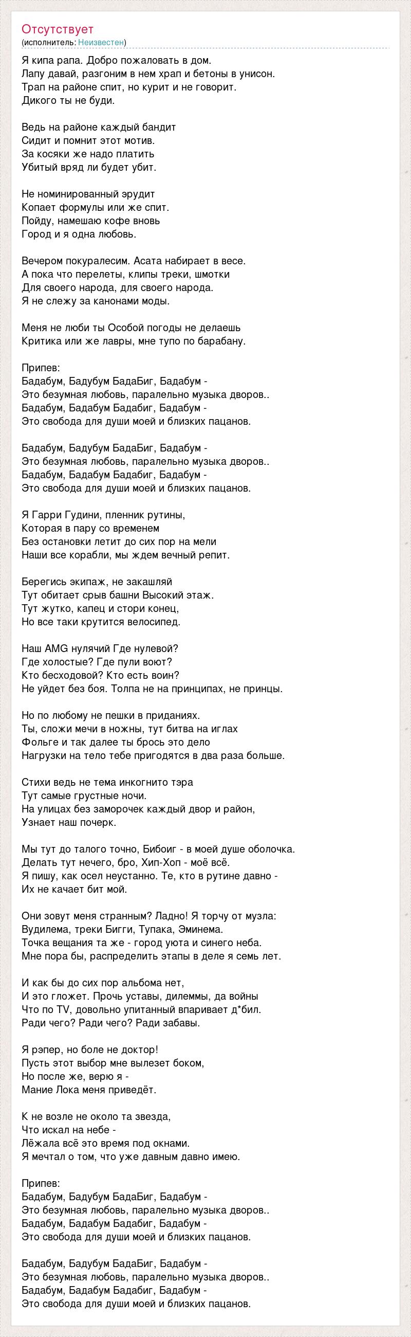 Я кипа рапа. Добро пожаловать в дом. Лапу давай, разгоним в нем храп и бетоны в унисон. Трап на районе спит, но курит и не говорит. Дикого ты не буди. Ведь на районе каждый бандит Сидит и помнит этот мотив. За косяки же надо платить Убитый вряд ли будет убит. Не номинированный эрудит Копает формулы или же спит. Пойду, намешаю кофе вновь Город и я одна любовь. Вечером покуралесим. Асата набирает в весе. А пока что перелеты, клипы треки, шмотки Для своего народа, для своего народа. Я не слежу за канонами моды. Меня не люби ты Особой погоды не делаешь Критика или же лавры, мне тупо по барабану. Припев: Бадабум, Бадубум БадаБиг, Бадабум - Это безумная любовь, паралельно музыка дворов.. Бадабум, Бадабум Бадабиг, Бадабум - Это свобода для души моей и близких пацанов. Бадабум, Бадубум БадаБиг, Бадабум - Это безумная любовь, паралельно музыка дворов.. Бадабум, Бадабум Бадабиг, Бадабум - Это свобода для души моей и близких пацанов. Я Гарри Гудини, пленник рутины, Которая в пару со временем Без остановки летит до сих пор на мели Наши все корабли, мы ждем вечный репит. Берегись экипаж, не закашляй Тут обитает срыв башни Высокий этаж. Тут жутко, капец и стори конец, Но все таки крутится велосипед. Наш AMG нулячий Где нулевой? Где холостые? Где пули воют? Кто бесходовой? Кто есть воин? Не уйдет без боя. Толпа не на принципах, не принцы. Но по любому не пешки в приданиях. Ты, сложи мечи в ножны, тут битва на иглах Фольге и так далее ты брось это дело Нагрузки на тело тебе пригодятся в два раза больше. Стихи ведь не тема инкогнито тэра Тут самые грустные ночи. На улицах без заморочек каждый двор и район, Узнает наш почерк. Мы тут до талого точно, Бибоиг - в моей душе оболочка. Делать тут нечего, бро, Хип-Хоп - моё всё. Я пишу, как осел неустанно. Те, кто в рутине давно - Их не качает бит мой. Они зовут меня странным? Ладно! Я торчу от музла: Вудилема, треки Бигги, Тупака, Эминема. Точка вещания та же - город уюта и синего неба. Мне пора бы, распределить этапы в деле я семь лет. И как бы до сих пор альбома нет, И это гложет. Прочь уставы, дилеммы, да войны Что по TV, довольно упитанный впаривает д*бил. Ради чего? Ради чего? Ради забавы. Я рэпер, но боле не доктор! Пусть этот выбор мне вылезет боком, Но после же, верю я - Мание Лока меня приведёт. К не возле не около та звезда, Что искал на небе - Лёжала всё это время под окнами. Я мечтал о том, что уже давным давно имею. Припев: Бадабум, Бадубум БадаБиг, Бадабум - Это безумная любовь, паралельно музыка дворов.. Бадабум, Бадабум Бадабиг, Бадабум - Это свобода для души моей и близких пацанов. Бадабум, Бадубум БадаБиг, Бадабум - Это безумная любовь, паралельно музыка дворов.. Бадабум, Бадабум Бадабиг, Бадабум - Это свобода для души моей и близких пацанов.