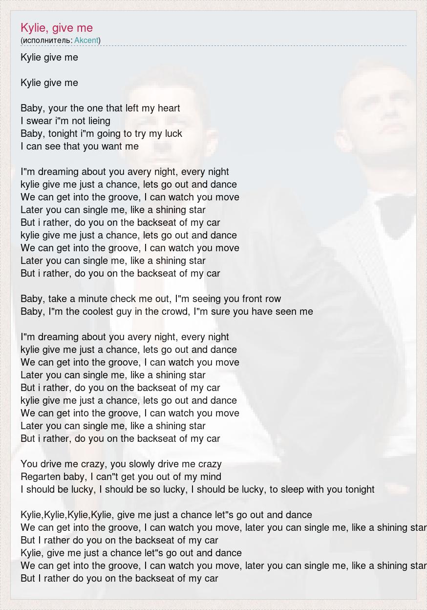 Kylie give me Kylie give me Baby, your the one that left my heart I swear i"m not lieing Baby, tonight i"m going to try my luck I can see that you want me I"m dreaming about you avery night, every night kylie give me just a chance, lets go out and dance We can get into the groove, I can watch you move Later you can single me, like a shining star But i rather, do you on the backseat of my car kylie give me just a chance, lets go out and dance We can get into the groove, I can watch you move Later you can single me, like a shining star But i rather, do you on the backseat of my car Baby, take a minute check me out, I"m seeing you front row Baby, I"m the coolest guy in the crowd, I"m sure you have seen me I"m dreaming about you avery night, every night kylie give me just a chance, lets go out and dance We can get into the groove, I can watch you move Later you can single me, like a shining star But i rather, do you on the backseat of my car kylie give me just a chance, lets go out and dance We can get into the groove, I can watch you move Later you can single me, like a shining star But i rather, do you on the backseat of my car You drive me crazy, you slowly drive me crazy Regarten baby, I can"t get you out of my mind I should be lucky, I should be so lucky, I should be lucky, to sleep with you tonight Kylie,Kylie,Kylie,Kylie, give me just a chance let"s go out and dance We can get into the groove, I can watch you move, later you can single me, like a shining star But I rather do you on the backseat of my car Kylie, give me just a chance let"s go out and dance We can get into the groove, I can watch you move, later you can single me, like a shining star But I rather do you on the backseat of my car