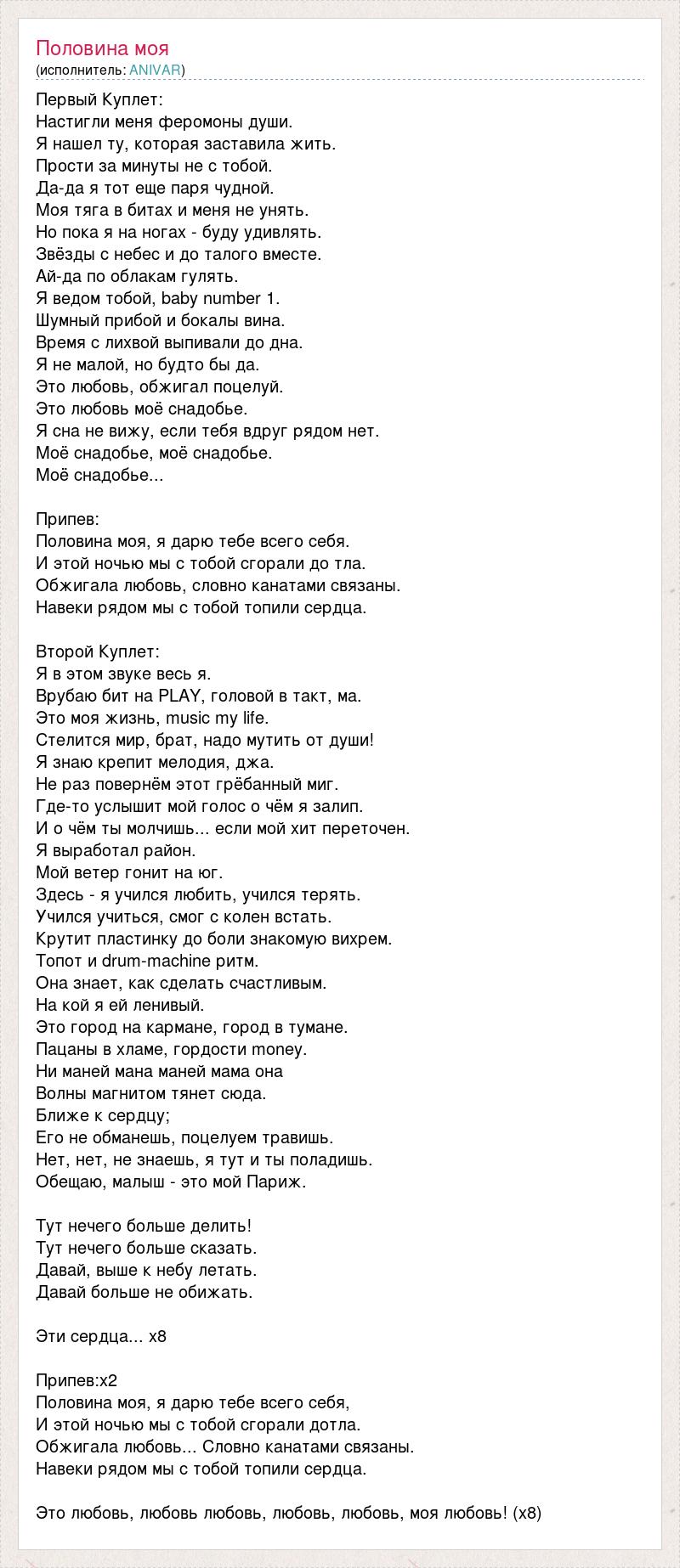 Первый Куплет: Настигли меня феромоны души. Я нашел ту, которая заставила жить. Прости за минуты не с тобой. Да-да я тот еще паря чудной. Моя тяга в битах и меня не унять. Но пока я на ногах - буду удивлять. Звёзды с небес и до талого вместе. Ай-да по облакам гулять. Я ведом тобой, baby number 1. Шумный прибой и бокалы вина. Время с лихвой выпивали до дна. Я не малой, но будто бы да. Это любовь, обжигал поцелуй. Это любовь моё снадобье. Я сна не вижу, если тебя вдруг рядом нет. Моё снадобье, моё снадобье. Моё снадобье... Припев: Половина моя, я дарю тебе всего себя. И этой ночью мы с тобой сгорали до тла. Обжигала любовь, словно канатами связаны. Навеки рядом мы с тобой топили сердца. Второй Куплет: Я в этом звуке весь я. Врубаю бит на PLAY, головой в такт, ма. Это моя жизнь, music my life. Стелится мир, брат, надо мутить от души! Я знаю крепит мелодия, джа. Не раз повернём этот грёбанный миг. Где-то услышит мой голос о чём я залип. И о чём ты молчишь... если мой хит переточен. Я выработал район. Мой ветер гонит на юг. Здесь - я учился любить, учился терять. Учился учиться, смог с колен встать. Крутит пластинку до боли знакомую вихрем. Топот и drum-machine ритм. Она знает, как сделать счастливым. На кой я ей ленивый. Это город на кармане, город в тумане. Пацаны в хламе, гордости money. Ни маней мана маней мама она Волны магнитом тянет сюда. Ближе к сердцу; Его не обманешь, поцелуем травишь. Нет, нет, не знаешь, я тут и ты поладишь. Обещаю, малыш - это мой Париж. Тут нечего больше делить! Тут нечего больше сказать. Давай, выше к небу летать. Давай больше не обижать. Эти сердца... x8 Припев:x2 Половина моя, я дарю тебе всего себя, И этой ночью мы с тобой сгорали дотла. Обжигала любовь... Словно канатами связаны. Навеки рядом мы с тобой топили сердца. Это любовь, любовь любовь, любовь, любовь, моя любовь! (х8)