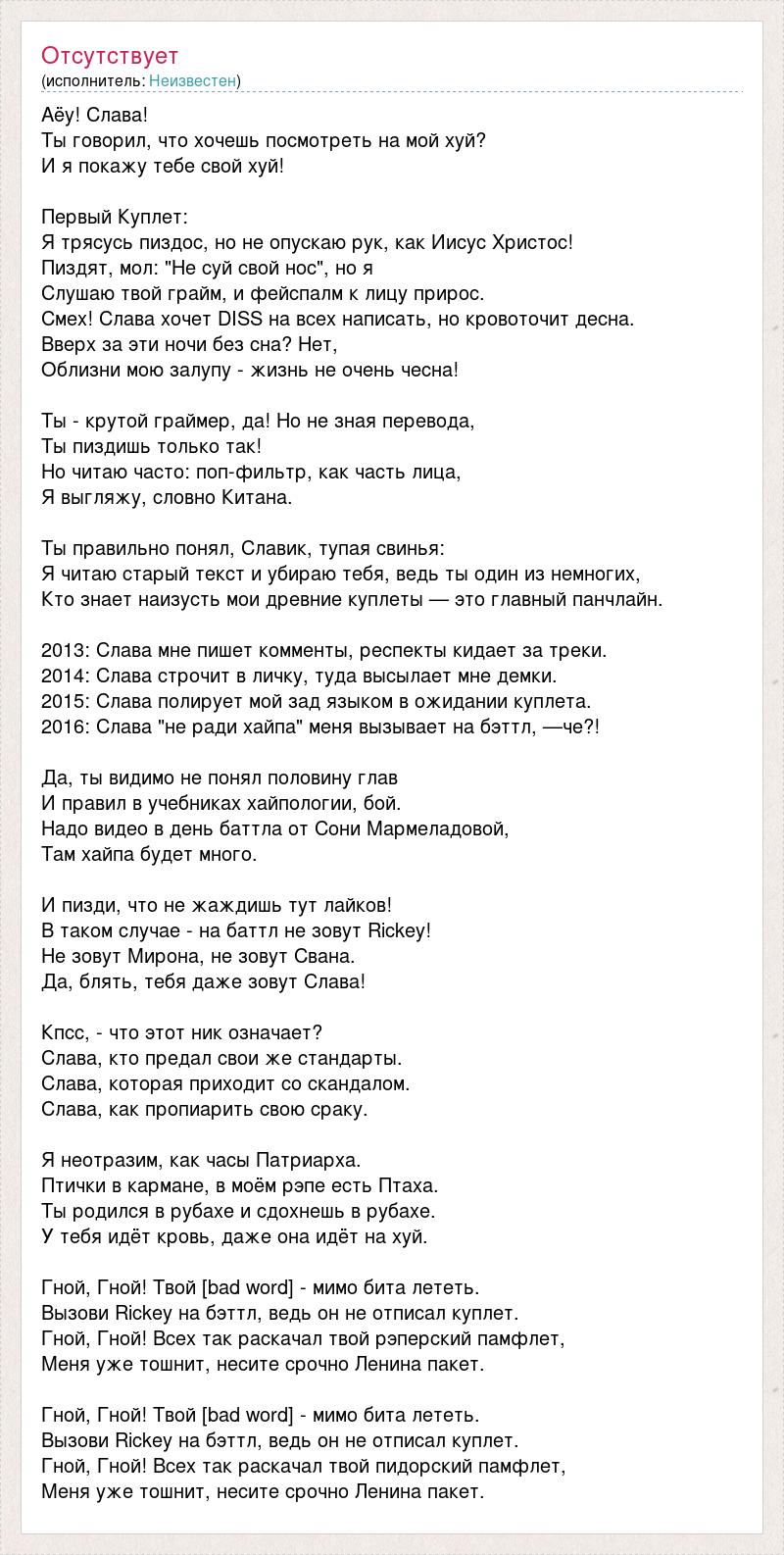 Аёу! Слава! Ты говорил, что хочешь посмотреть на мой хуй? И я покажу тебе свой хуй! Первый Куплет: Я трясусь пиздос, но не опускаю рук, как Иисус Христос! Пиздят, мол: "Не суй свой нос", но я Слушаю твой грайм, и фейспалм к лицу прирос. Смех! Слава хочет DISS на всех написать, но кровоточит десна. Вверх за эти ночи без сна? Нет, Облизни мою залупу - жизнь не очень чесна! Ты - крутой граймер, да! Но не зная перевода, Ты пиздишь только так! Но читаю часто: поп-фильтр, как часть лица, Я выгляжу, словно Китана. Ты правильно понял, Славик, тупая свинья: Я читаю старый текст и убираю тебя, ведь ты один из немногих, Кто знает наизусть мои древние куплеты — это главный панчлайн. 2013: Слава мне пишет комменты, респекты кидает за треки. 2014: Слава строчит в личку, туда высылает мне демки. 2015: Слава полирует мой зад языком в ожидании куплета. 2016: Слава "не ради хайпа" меня вызывает на бэттл, —че?! Да, ты видимо не понял половину глав И правил в учебниках хайпологии, бой. Надо видео в день баттла от Сони Мармеладовой, Там хайпа будет много. И пизди, что не жаждишь тут лайков! В таком случае - на баттл не зовут Rickey! Не зовут Мирона, не зовут Свана. Да, блять, тебя даже зовут Слава! Кпсс, - что этот ник означает? Слава, кто предал свои же стандарты. Слава, которая приходит со скандалом. Слава, как пропиарить свою сраку. Я неотразим, как часы Патриарха. Птички в кармане, в моём рэпе есть Птаха. Ты родился в рубахе и сдохнешь в рубахе. У тебя идёт кровь, даже она идёт на xуй. Гной, Гной! Твой [bad word] - мимо бита лететь. Вызови Rickey на бэттл, ведь он не отписал куплет. Гной, Гной! Всех так раскачал твой рэперский памфлет, Меня уже тошнит, несите срочно Ленина пакет. Гной, Гной! Твой [bad word] - мимо бита лететь. Вызови Rickey на бэттл, ведь он не отписал куплет. Гной, Гной! Всех так раскачал твой пидорский памфлет, Меня уже тошнит, несите срочно Ленина пакет.