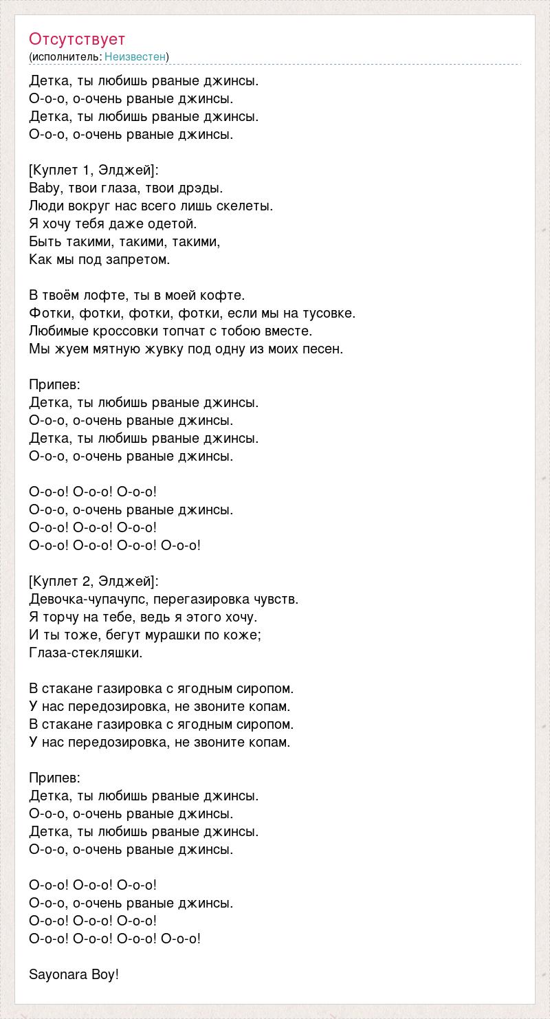Детка, ты любишь рваные джинсы. О-о-о, о-очень рваные джинсы. Детка, ты любишь рваные джинсы. О-о-о, о-очень рваные джинсы. [Куплет 1, Элджей]: Baby, твои глаза, твои дрэды. Люди вокруг нас всего лишь скелеты. Я хочу тебя даже одетой. Быть такими, такими, такими, Как мы под запретом. В твоём лофте, ты в моей кофте. Фотки, фотки, фотки, фотки, если мы на тусовке. Любимые кроссовки топчат с тобою вместе. Мы жуем мятную жувку под одну из моих песен. Припев: Детка, ты любишь рваные джинсы. О-о-о, о-очень рваные джинсы. Детка, ты любишь рваные джинсы. О-о-о, о-очень рваные джинсы. О-о-о! О-о-о! О-о-о! О-о-о, о-очень рваные джинсы. О-о-о! О-о-о! О-о-о! О-о-о! О-о-о! О-о-о! О-о-о! [Куплет 2, Элджей]: Девочка-чупачупс, перегазировка чувств. Я торчу на тебе, ведь я этого хочу. И ты тоже, бегут мурашки по коже; Глаза-стекляшки. В стакане газировка с ягодным сиропом. У нас передозировка, не звоните копам. В стакане газировка с ягодным сиропом. У нас передозировка, не звоните копам. Припев: Детка, ты любишь рваные джинсы. О-о-о, о-очень рваные джинсы. Детка, ты любишь рваные джинсы. О-о-о, о-очень рваные джинсы. О-о-о! О-о-о! О-о-о! О-о-о, о-очень рваные джинсы. О-о-о! О-о-о! О-о-о! О-о-о! О-о-о! О-о-о! О-о-о! Sayonara Boy!