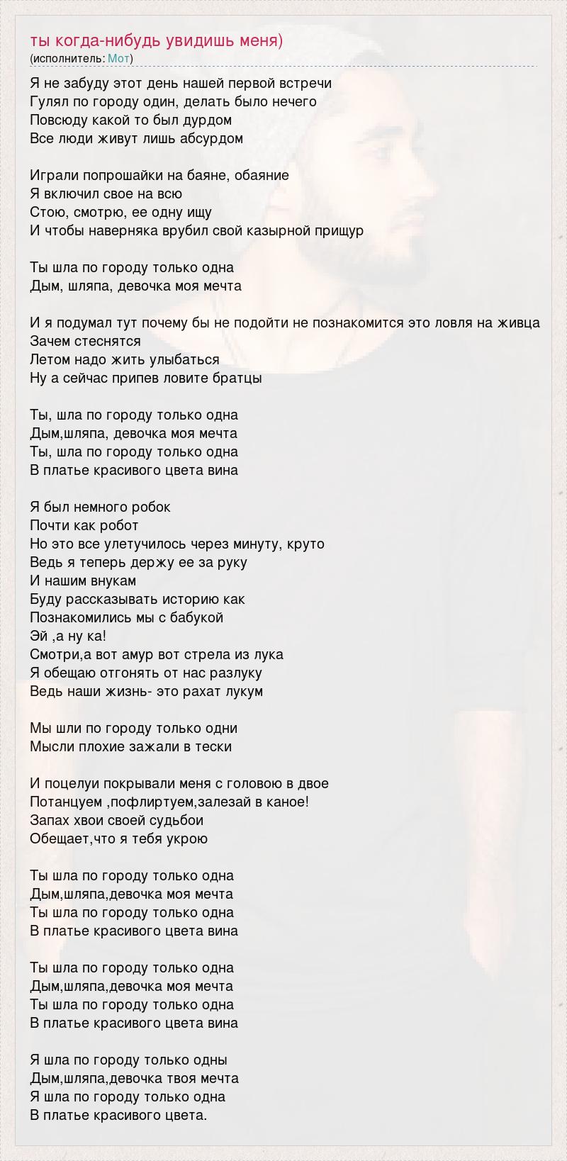 Я не забуду этот день нашей первой встречи Гулял по городу один, делать было нечего Повсюду какой то был дурдом Все люди живут лишь абсурдом Играли попрошайки на баяне, обаяние Я включил свое на всю Стою, смотрю, ее одну ищу И чтобы наверняка врубил свой казырной прищур Ты шла по городу только одна Дым, шляпа, девочка моя мечта И я подумал тут почему бы не подойти не познакомится это ловля на живца Зачем стеснятся Летом надо жить улыбаться Ну а сейчас припев ловите братцы Ты, шла по городу только одна Дым,шляпа, девочка моя мечта Ты, шла по городу только одна В платье красивого цвета вина Я был немного робок Почти как робот Но это все улетучилось через минуту, круто Ведь я теперь держу ее за руку И нашим внукам Буду рассказывать историю как Познакомились мы с бабукой Эй ,а ну ка! Смотри,а вот амур вот стрела из лука Я обещаю отгонять от нас разлуку Ведь наши жизнь- это рахат лукум Мы шли по городу только одни Мысли плохие зажали в тески И поцелуи покрывали меня с головою в двое Потанцуем ,пофлиртуем,залезай в каное! Запах хвои своей судьбои Обещает,что я тебя укрою Ты шла по городу только одна Дым,шляпа,девочка моя мечта Ты шла по городу только одна В платье красивого цвета вина Ты шла по городу только одна Дым,шляпа,девочка моя мечта Ты шла по городу только одна В платье красивого цвета вина Я шла по городу только одны Дым,шляпа,девочка твоя мечта Я шла по городу только одна В платье красивого цвета.