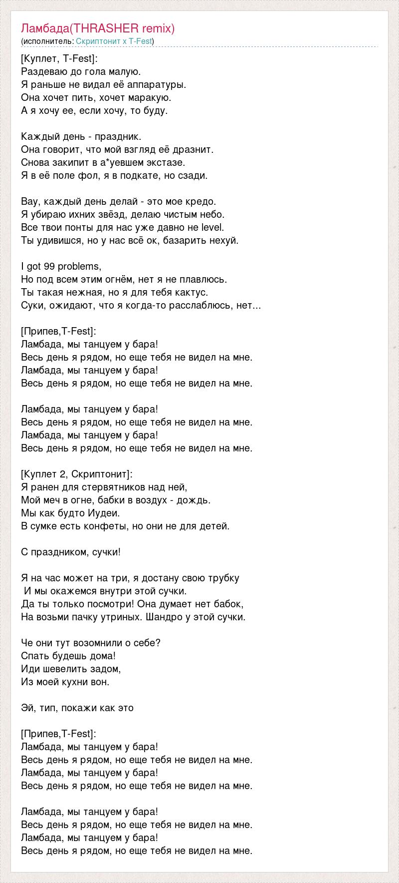 [Куплет, T-Fest]: Раздеваю до гола малую. Я раньше не видал её аппаратуры. Она хочет пить, хочет маракую. А я хочу ее, если хочу, то буду. Каждый день - праздник. Она говорит, что мой взгляд её дразнит. Снова закипит в а*уевшем экстазе. Я в её поле фол, я в подкате, но сзади. Вау, каждый день делай - это мое кредо. Я убираю ихних звёзд, делаю чистым небо. Все твои понты для нас уже давно не level. Ты удивишся, но у нас всё ок, базарить нехуй. I got 99 problems, Но под всем этим огнём, нет я не плавлюсь. Ты такая нежная, но я для тебя кактус. Суки, ожидают, что я когда-то расслаблюсь, нет... [Припев,T-Fest]: Ламбада, мы танцуем у бара! Весь день я рядом, но еще тебя не видел на мне. Ламбада, мы танцуем у бара! Весь день я рядом, но еще тебя не видел на мне. Ламбада, мы танцуем у бара! Весь день я рядом, но еще тебя не видел на мне. Ламбада, мы танцуем у бара! Весь день я рядом, но еще тебя не видел на мне. [Куплет 2, Скриптонит]: Я ранен для стервятников над ней, Мой меч в огне, бабки в воздух - дождь. Мы как будто Иудеи. В сумке есть конфеты, но они не для детей. С праздником, сучки! Я на час может на три, я достану свою трубку И мы окажемся внутри этой сучки. Да ты только посмотри! Она думает нет бабок, На возьми пачку утриных. Шандро у этой сучки. Че они тут возомнили о себе? Спать будешь дома! Иди шевелить задом, Из моей кухни вон. Эй, тип, покажи как это [Припев,T-Fest]: Ламбада, мы танцуем у бара! Весь день я рядом, но еще тебя не видел на мне. Ламбада, мы танцуем у бара! Весь день я рядом, но еще тебя не видел на мне. Ламбада, мы танцуем у бара! Весь день я рядом, но еще тебя не видел на мне. Ламбада, мы танцуем у бара! Весь день я рядом, но еще тебя не видел на мне.