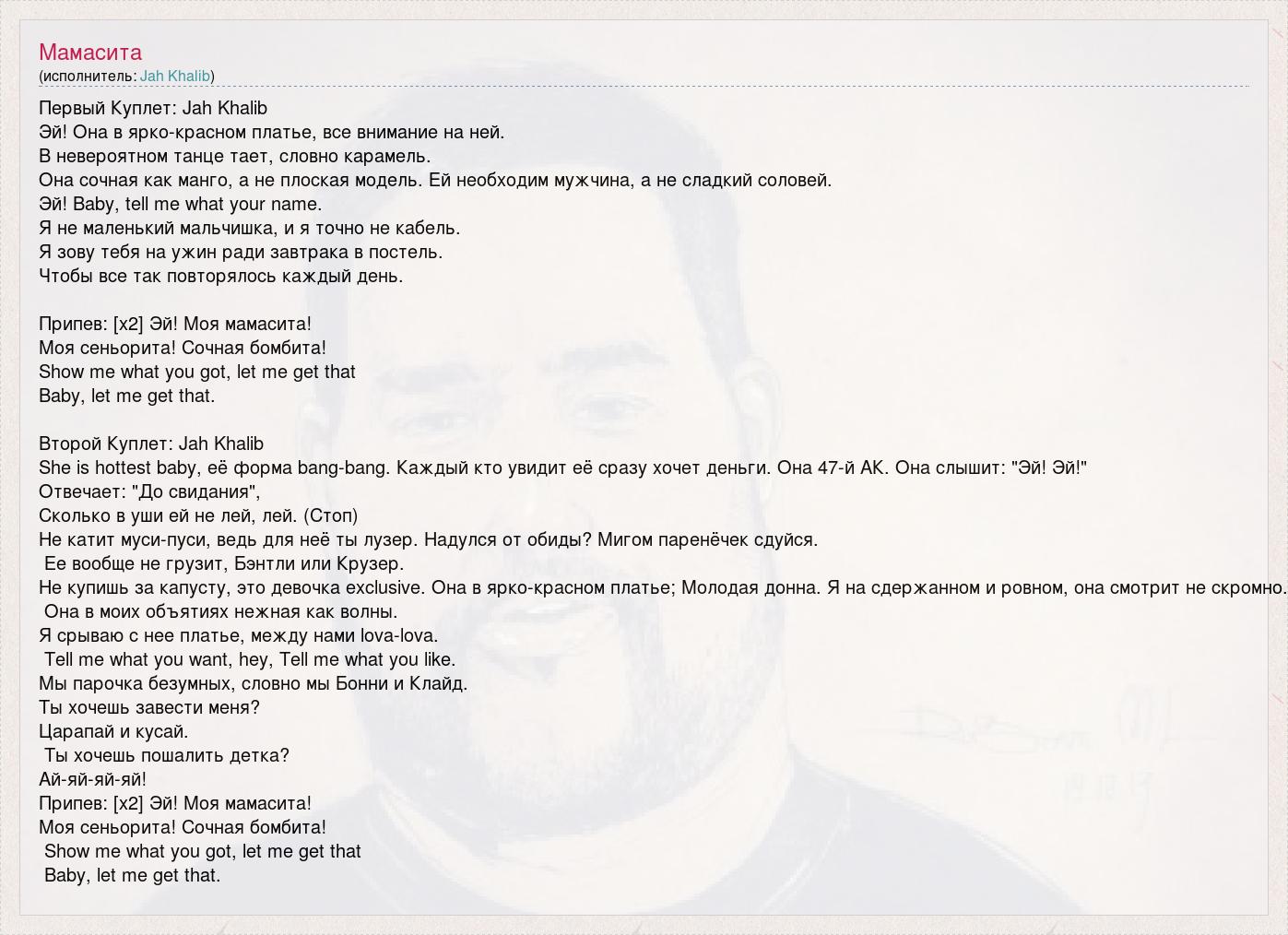 Первый Куплет: Jah Khalib Эй! Она в ярко-красном платье, все внимание на ней. В невероятном танце тает, словно карамель. Она сочная как манго, а не плоская модель. Ей необходим мужчина, а не сладкий соловей. Эй! Baby, tell me what your name. Я не маленький мальчишка, и я точно не кабель. Я зову тебя на ужин ради завтрака в постель. Чтобы все так повторялось каждый день. Припев: [x2] Эй! Моя мамасита! Моя сеньорита! Сочная бомбита! Show me what you got, let me get that Baby, let me get that. Второй Куплет: Jah Khalib She is hottest baby, её форма bang-bang. Каждый кто увидит её сразу хочет деньги. Она 47-й АК. Она слышит: "Эй! Эй!" Отвечает: "До свидания", Сколько в уши ей не лей, лей. (Стоп) Не катит муси-пуси, ведь для неё ты лузер. Надулся от обиды? Мигом паренёчек сдуйся. Ее вообще не грузит, Бэнтли или Крузер. Не купишь за капусту, это девочка exclusive. Она в ярко-красном платье; Молодая донна. Я на сдержанном и ровном, она смотрит не скромно. Она в моих объятиях нежная как волны. Я срываю с нее платье, между нами lova-lova. Tell me what you want, hey, Tell me what you like. Мы парочка безумных, словно мы Бонни и Клайд. Ты хочешь завести меня? Царапай и кусай. Ты хочешь пошалить детка? Ай-яй-яй-яй! Припев: [x2] Эй! Моя мамасита! Моя сеньорита! Сочная бомбита! Show me what you got, let me get that Baby, let me get that.